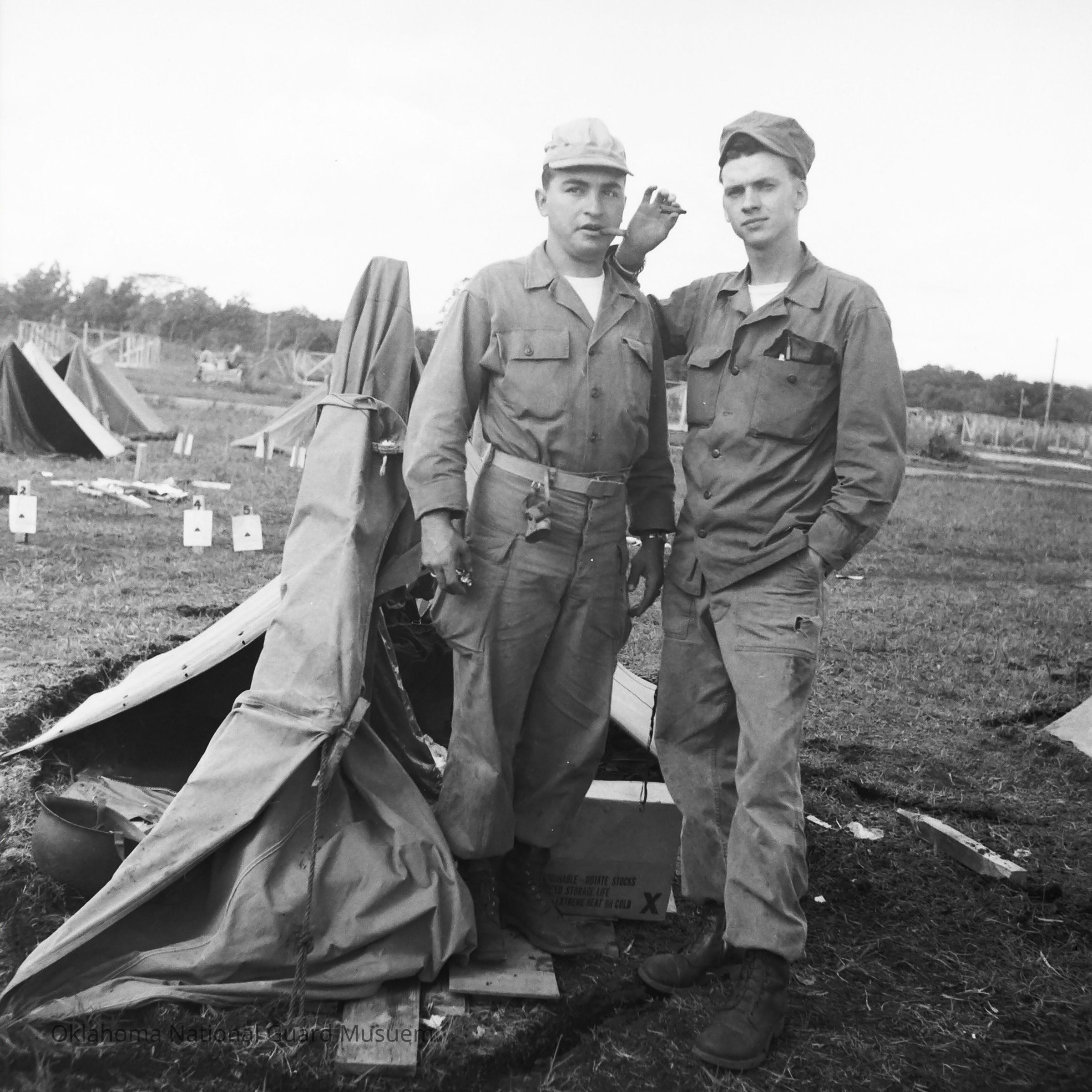 Two soldiers posing in front of tents with cigars
