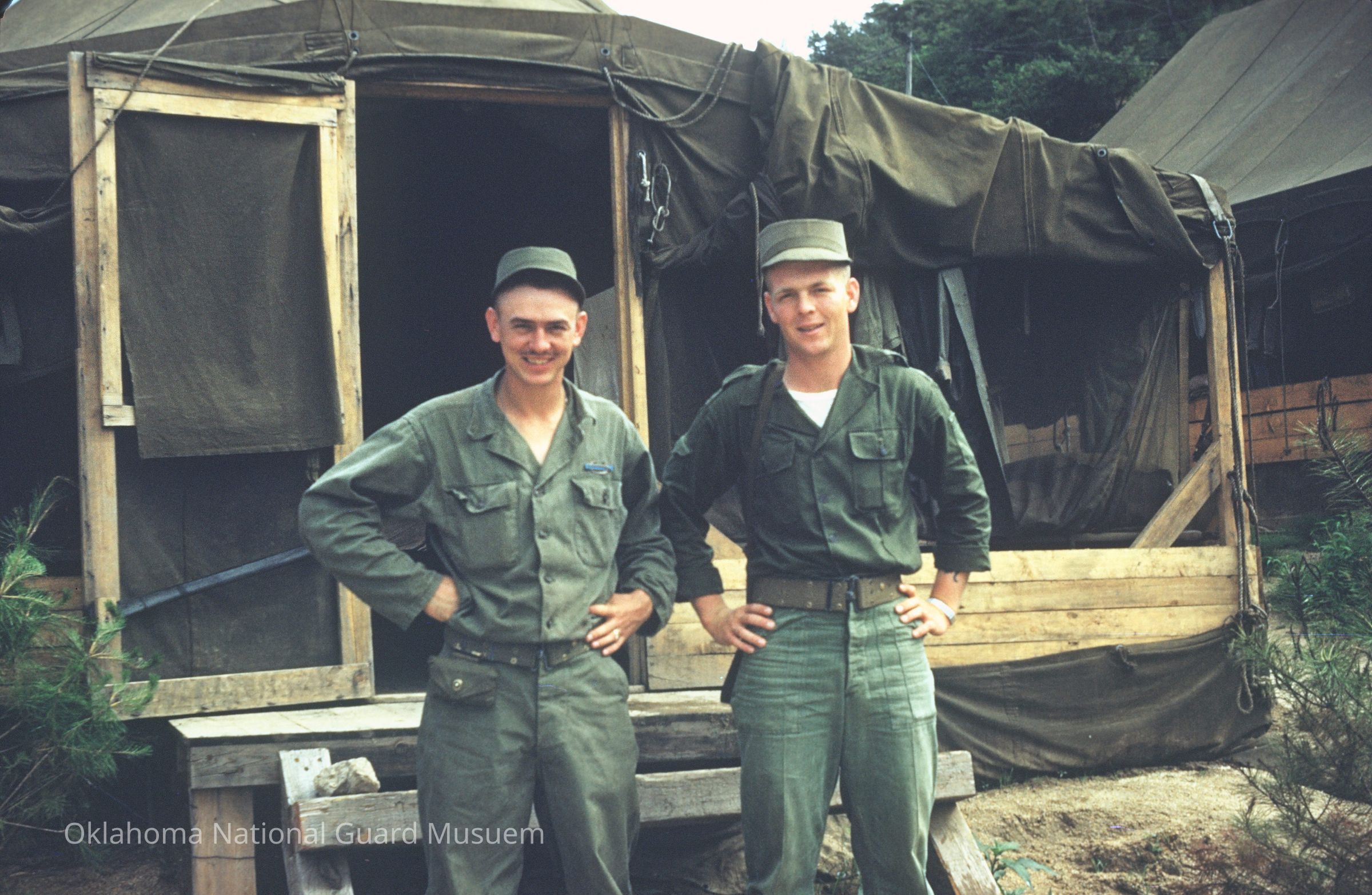 Two soldiers posing outside of a tent