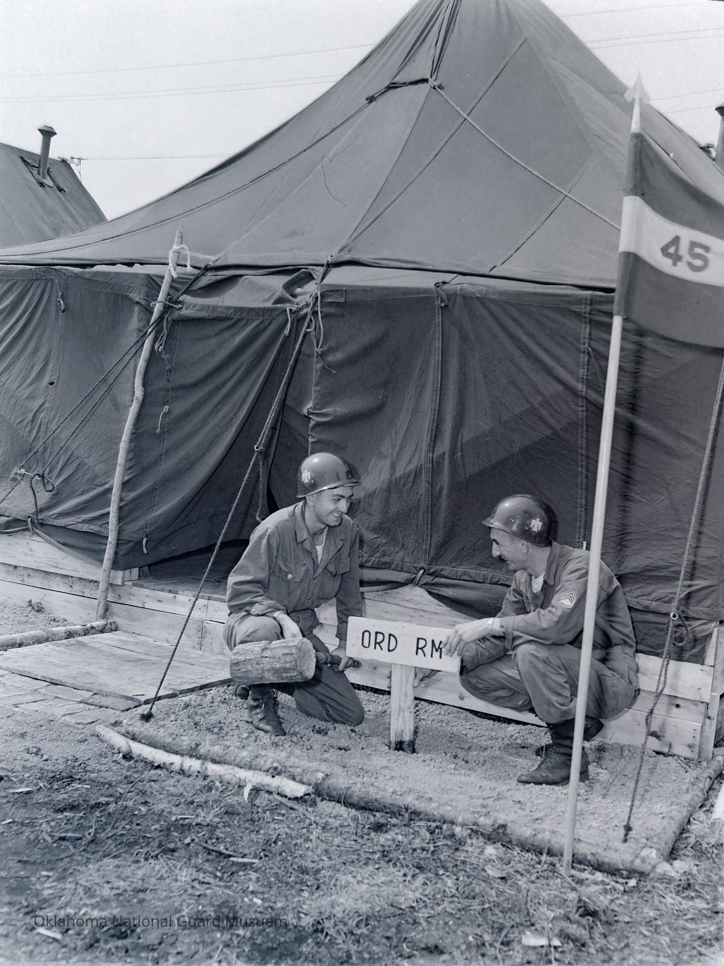 Two soldiers posting and "Orderly Room" sign outside a tent