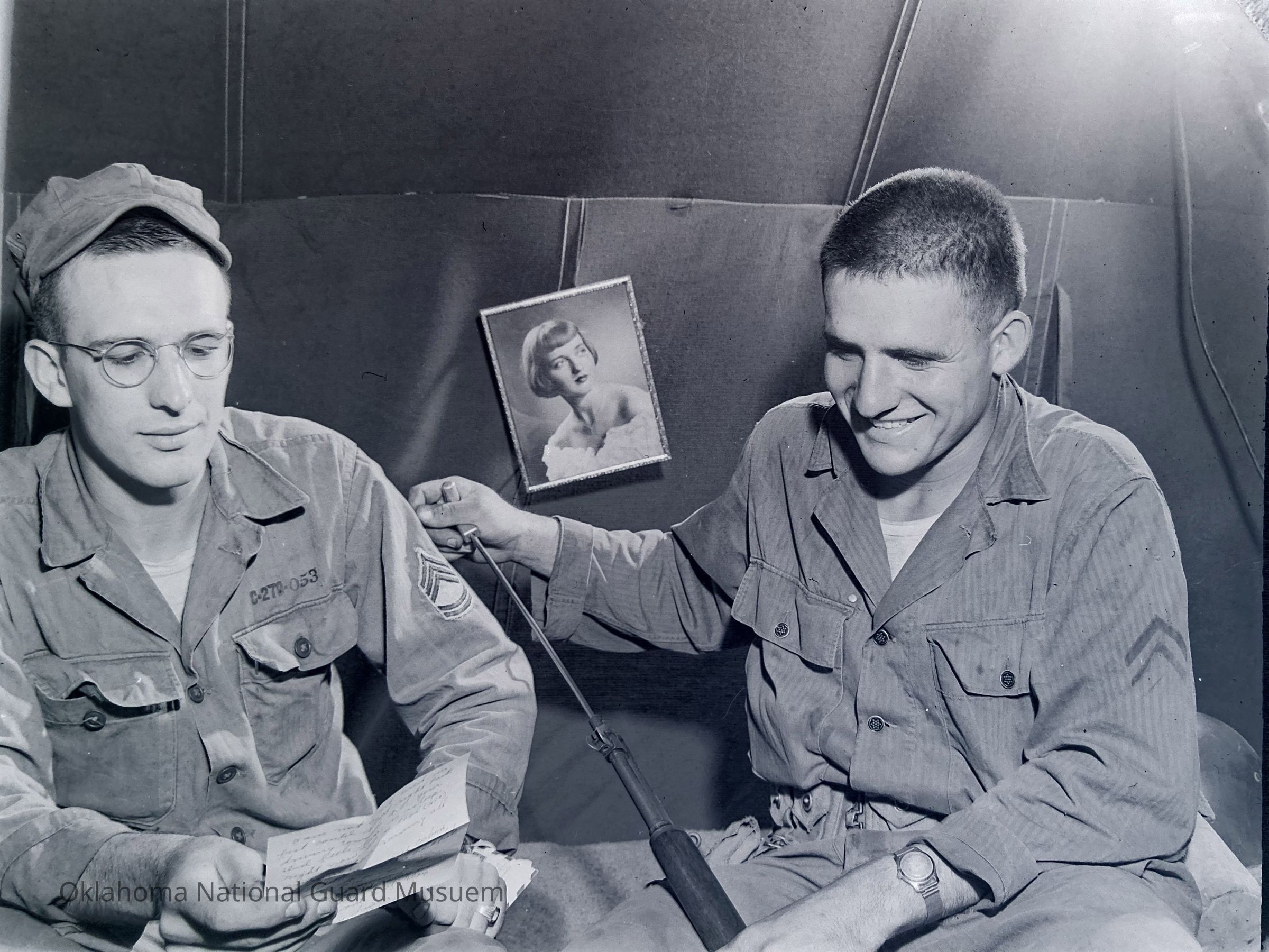 Negative of two soldiers sitting on bunk- one reading a letter, the other cleaning a rifle on Hokkaido, Japan