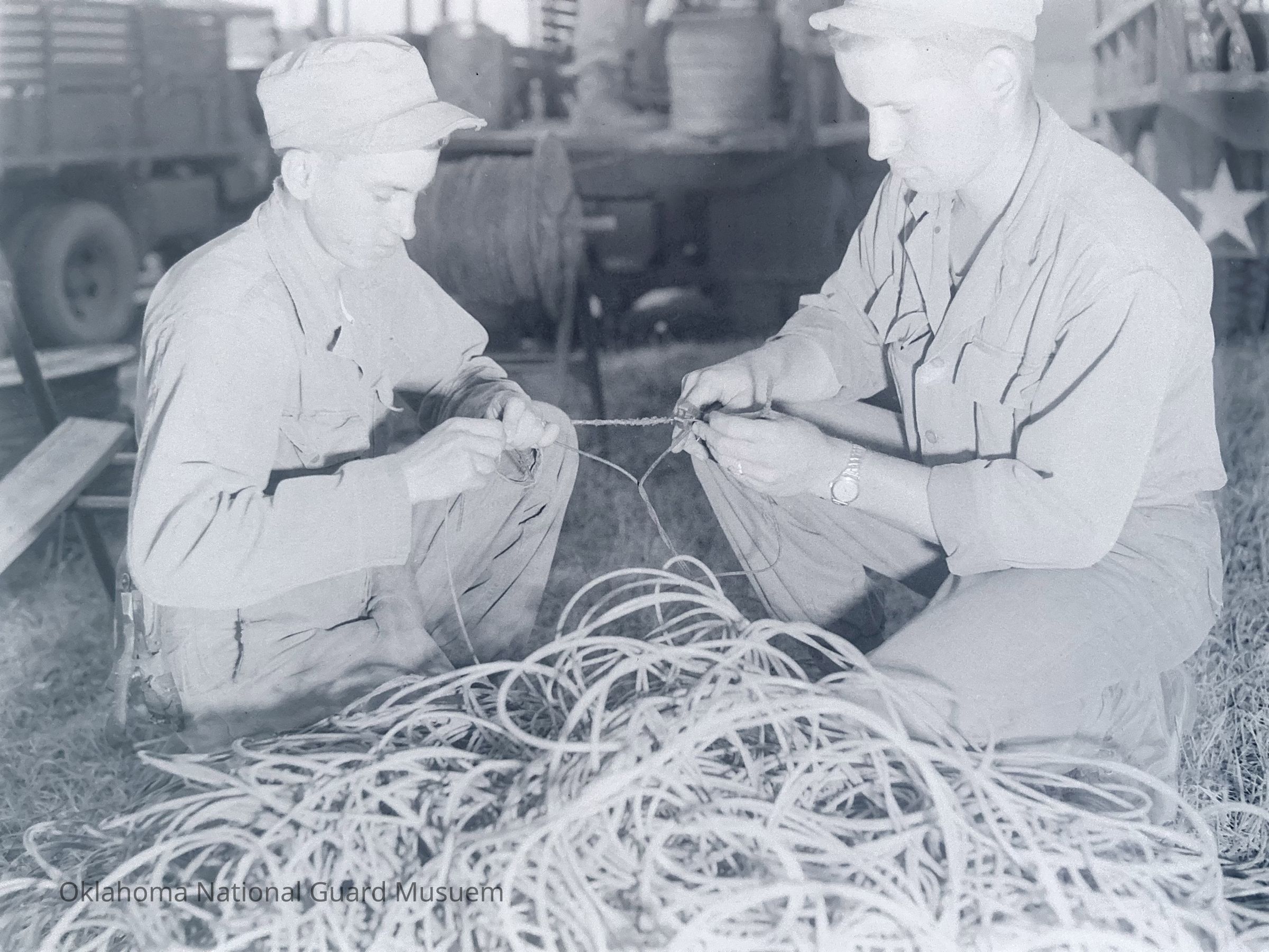 Negative of two soldiers splicing commo wire on Hokkaido, Japan