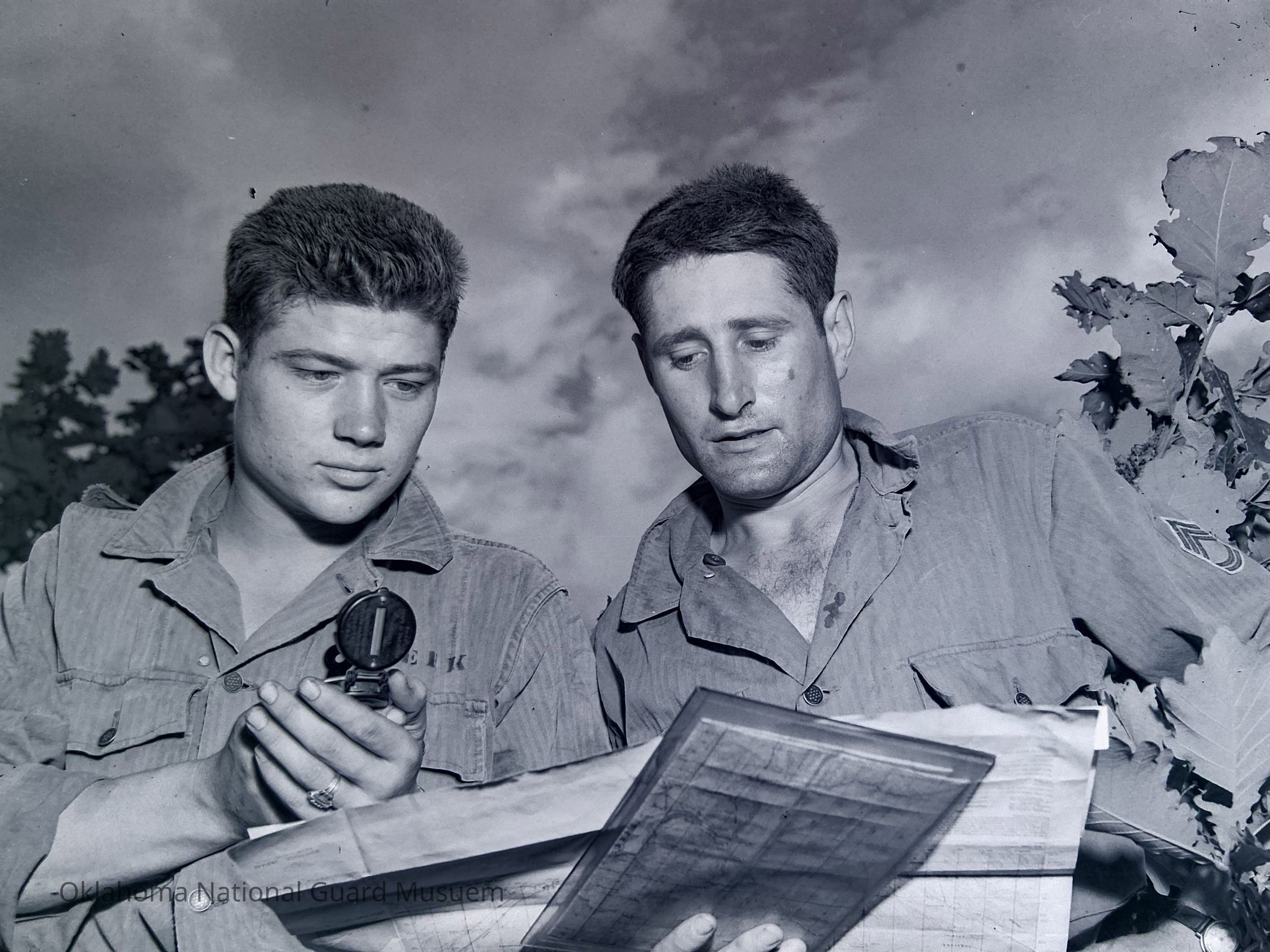 Negative of two soldiers using a compass and map on Hokkaido, Japan