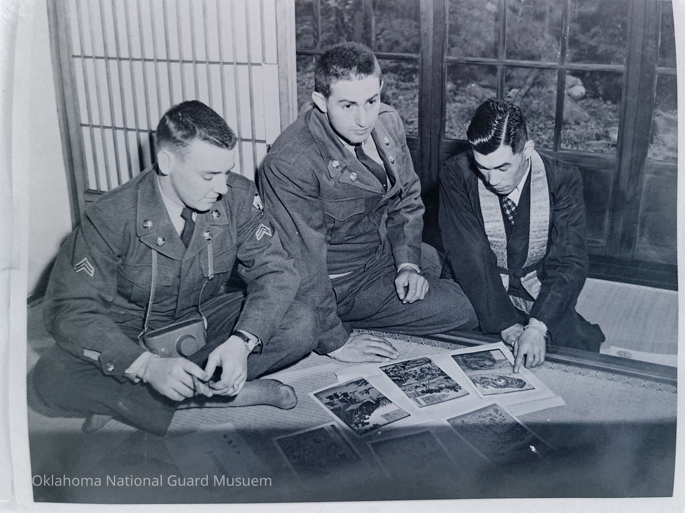 Two soldiers viewing artwork with a Japanese man
