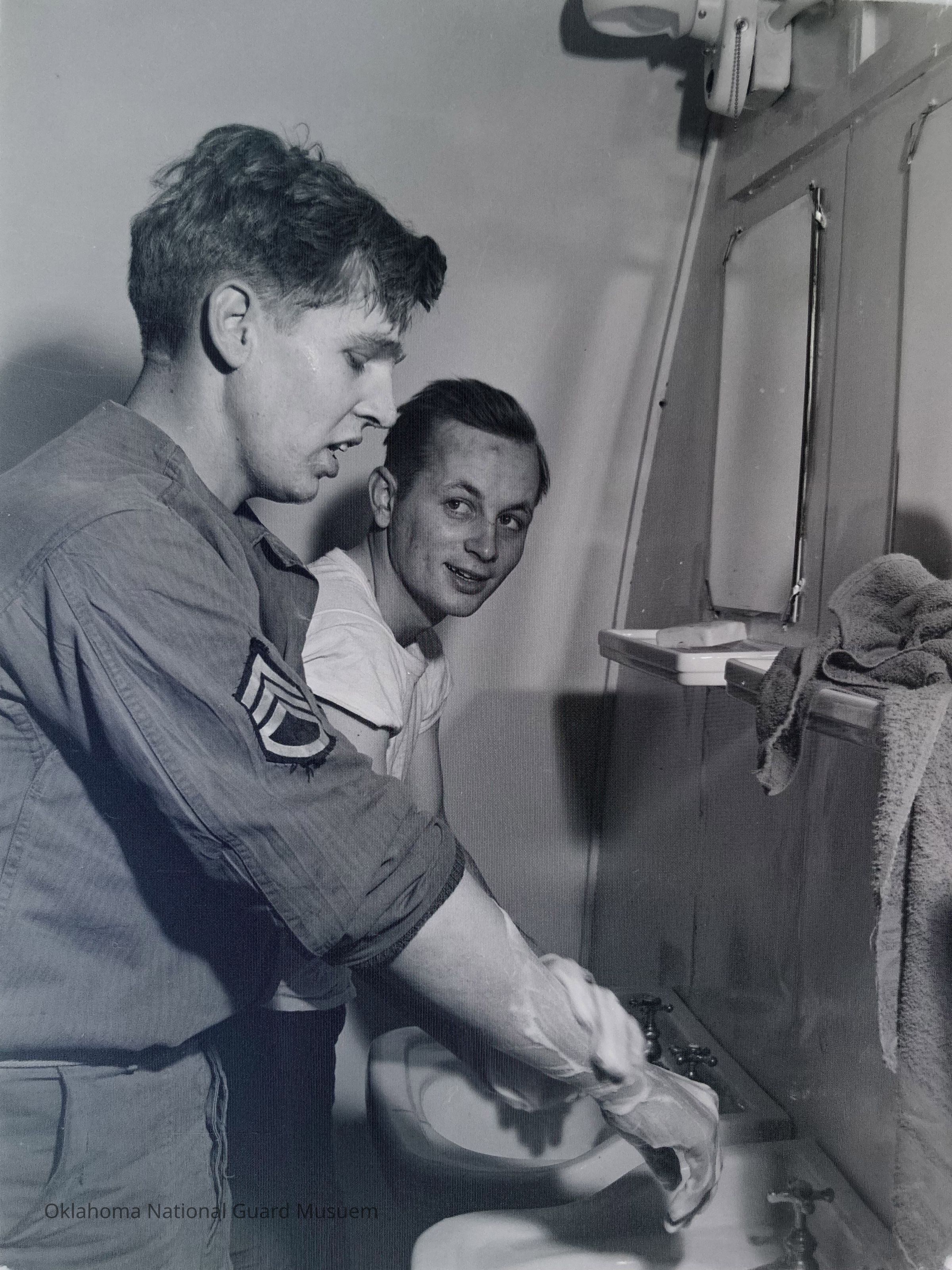 Two soldiers washing up in barracks latrine