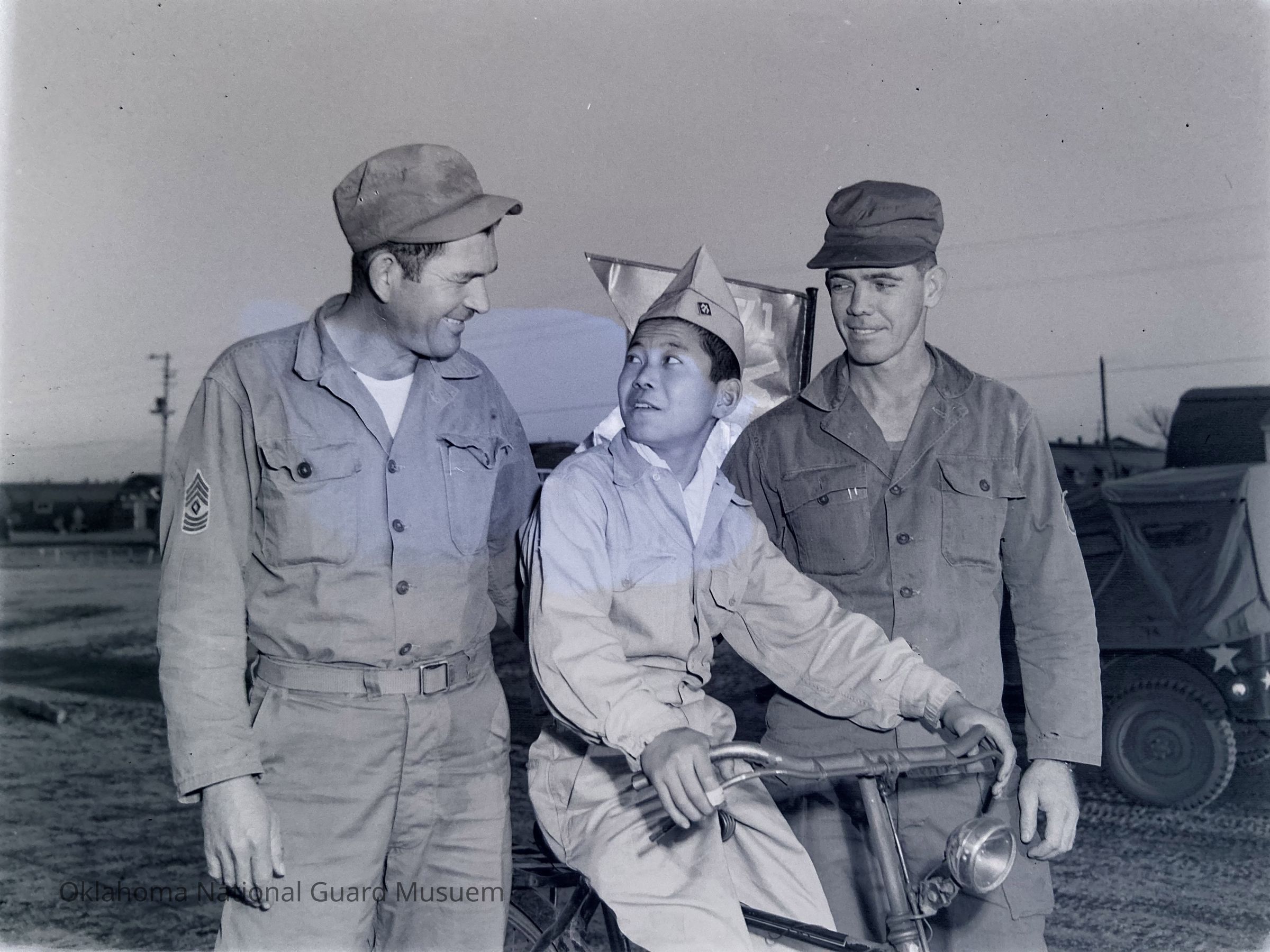 Two soldiers with Japanese boy on bicycle