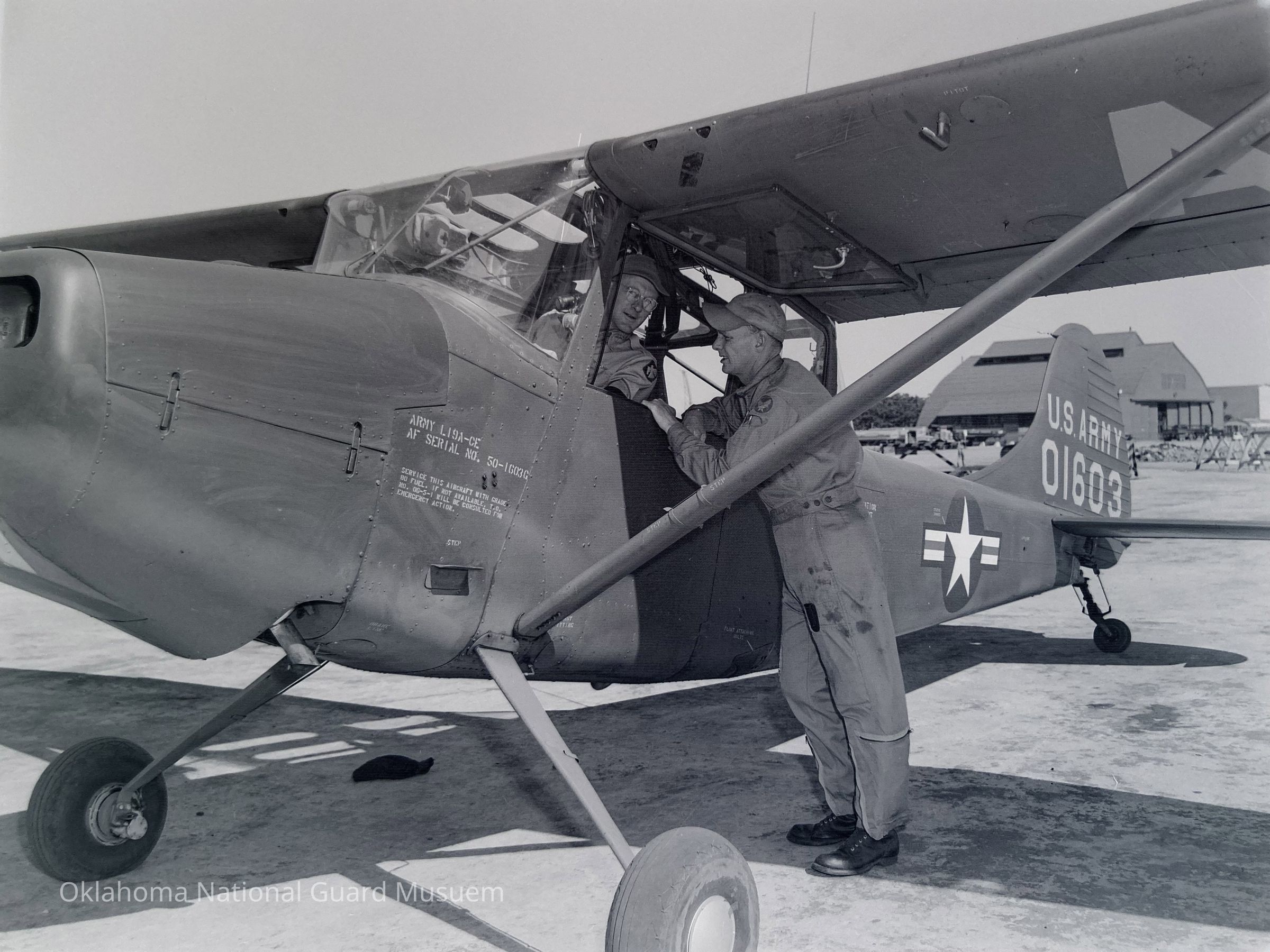 Negative of two soldiers with light aircraft at airstrip on Hokkaido, Japan