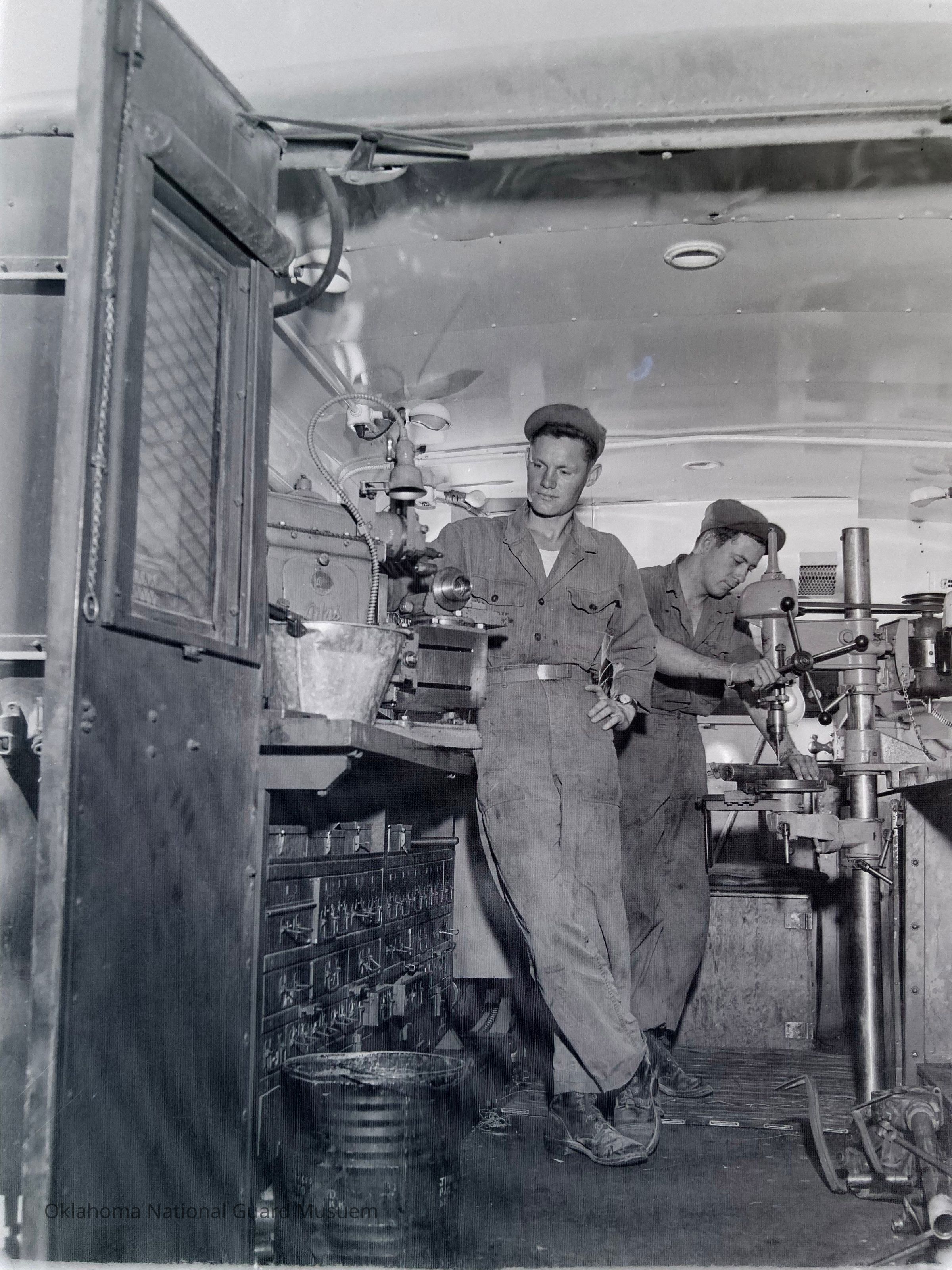 Two soldiers working in a mobile machine shop