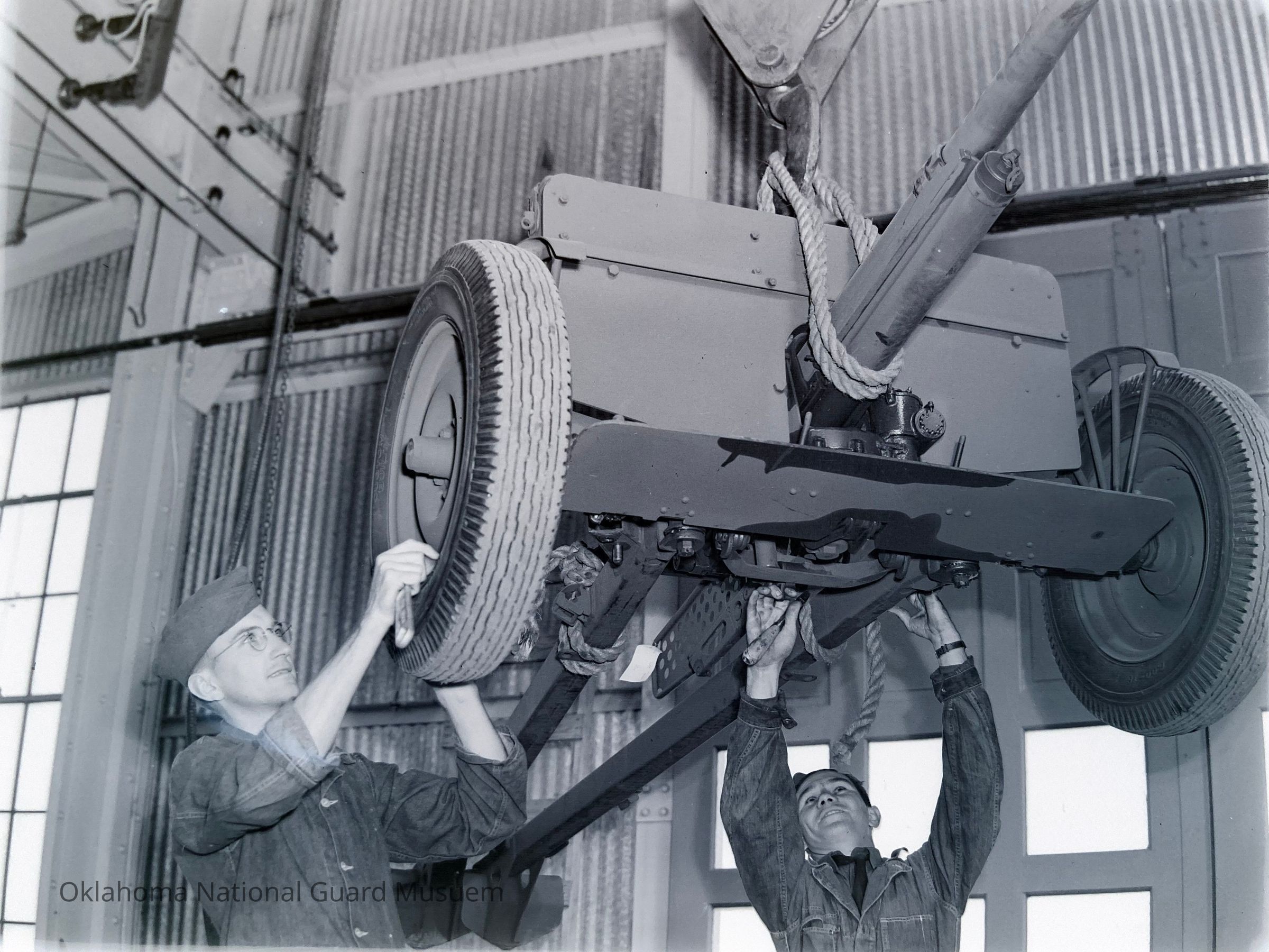 Negative of two soldiers working on an anti-tank gun on a hoist
