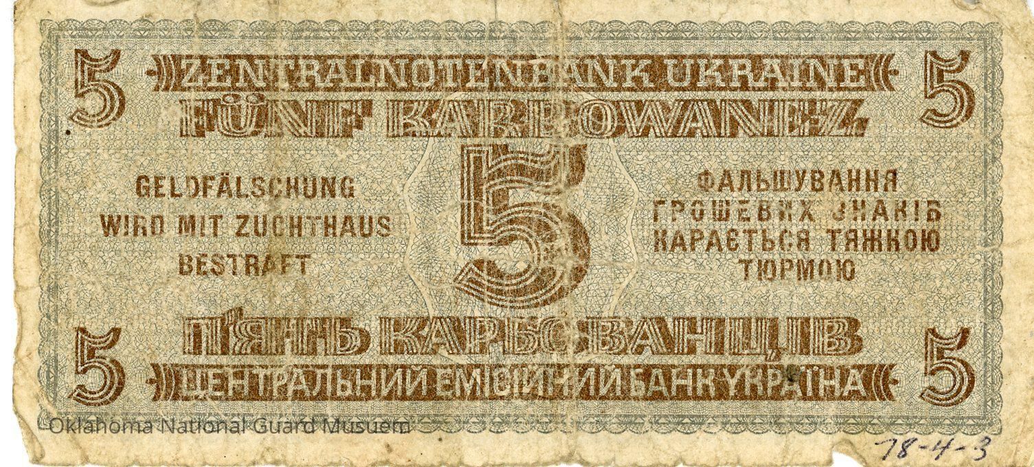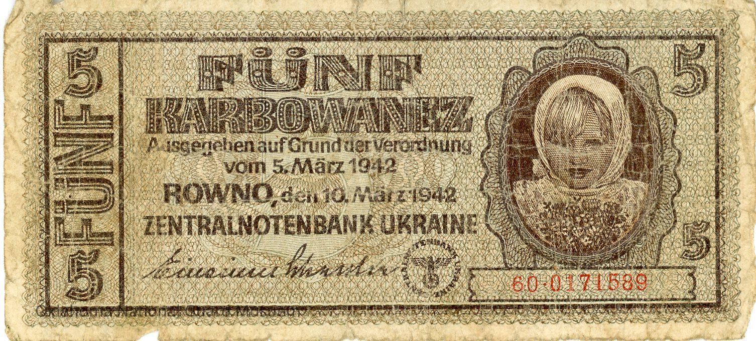 On the ornamented background of figure '5' there is denomination on German: FÜNF KARBOWANEZ is marked in letters. Beneath there is the text: Ausgegeben auf Grund der Verordnung vom 5. März 1942 / ROWNO, den 10. März 1942. ZENTRALNOTENBANK UKRAINE, under it there is the signature of director of Central Bank, to the right of signature there is stamping looks like the coat of arms of German Empire (the eagle with the open wings holds in paws a wreath from oak leaves with a swastika) and circular inscription: ZENTRALNOTENBANK UKRAINE. In four corners of note there is the denomination '5', at the left there is vertical denomination: FÜNF. To the right there is portrait of young girl in so called 'mandala' (sacral decorative vignette), beneath it there is series number, 7 digit serial, red color. Background colors are grey and brown-light, print color is brown.Transcription