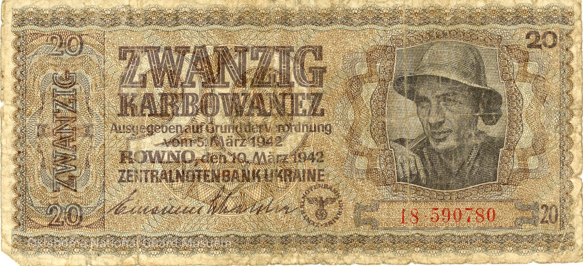 On the ornamented background of figure '20' there is denomination on German: ZWANZIG KARBOWANEZ is marked in letters. Beneath there is the text: Ausgegeben auf Grund der Verordnung vom 5. März 1942 / ROWNO, den 10. März 1942. ZENTRALNOTENBANK UKRAINE, under it there is the signature of director of Central Bank, to the right of signature there is stamping looks like the coat of arms of German Empire (the eagle with the open wings holds in paws a wreath from oak leaves with a swastika) and circular inscription: ZENTRALNOTENBANK UKRAINE. In four corners of note there is the denomination '20', at the left there is vertical denomination: ZWANZIG. To the right there is portrait of industrial worker in so called 'mandala' (sacral decorative vignette), beneath it there is series number, 6 digit serial, red color. Background colors are brown and grey, print color is violet-black.Transcription