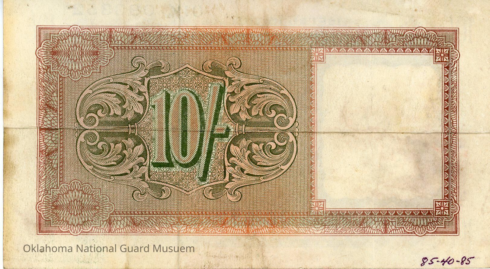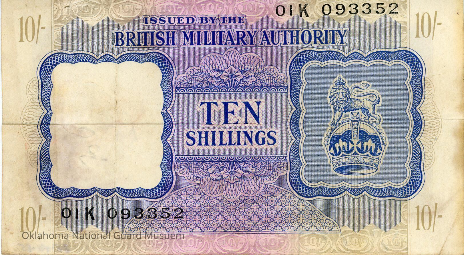 United Kingdom Military Authority Ten Shillings-1943. Accession number written on reverse in bottom right corner