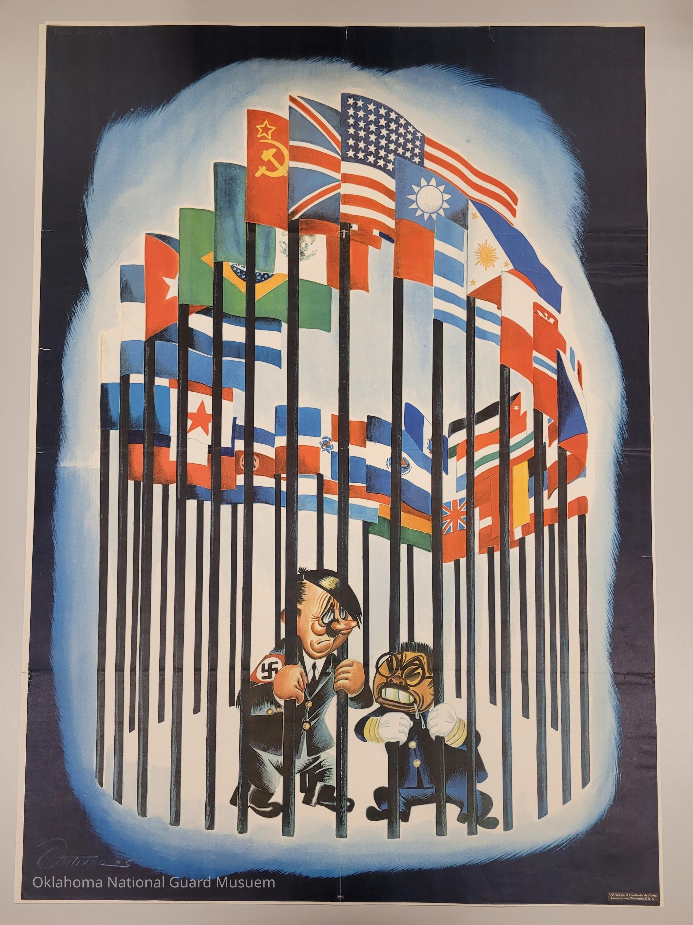 A Spanish language color poster featuring a cartoon illustration of Adolf Hitler and Hideki Tojo inside a circular jail of flagpoles flying the flags of the various United Nations countriesContext