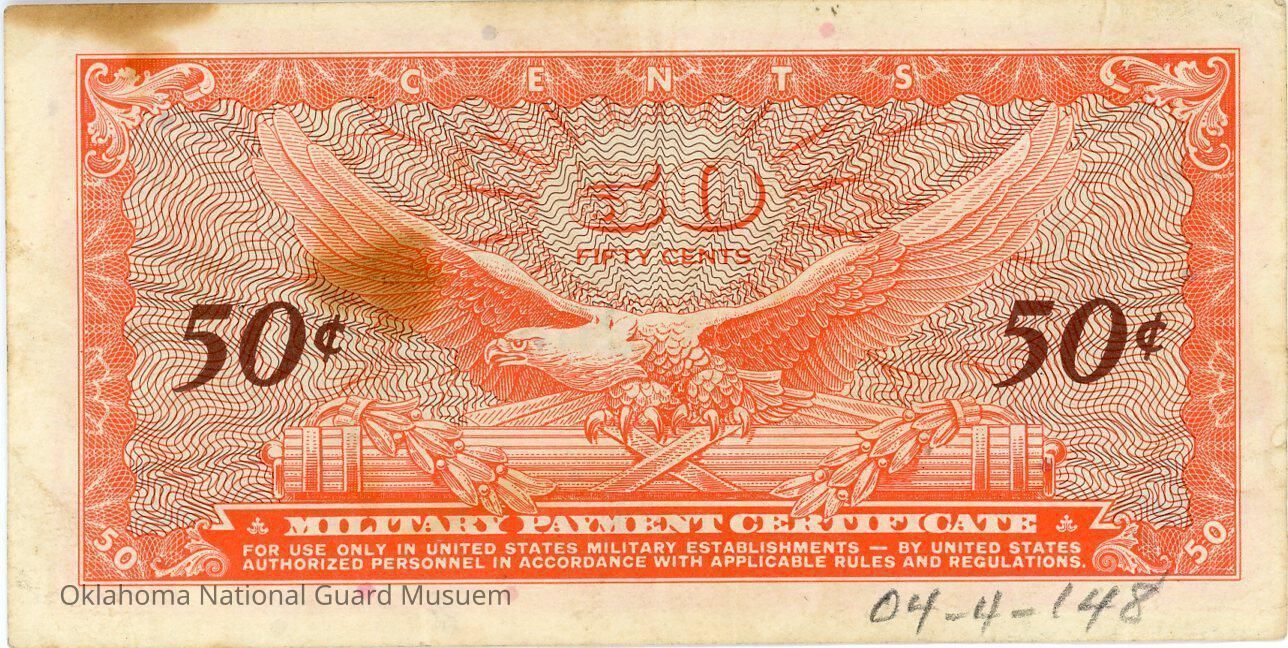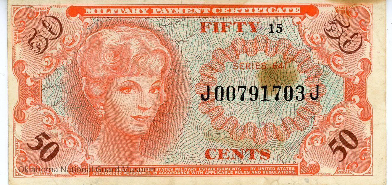 United States Military Payment Certificate Fifty Cents-1965-1968. Accession number written on reverse in bottom right cornerContext