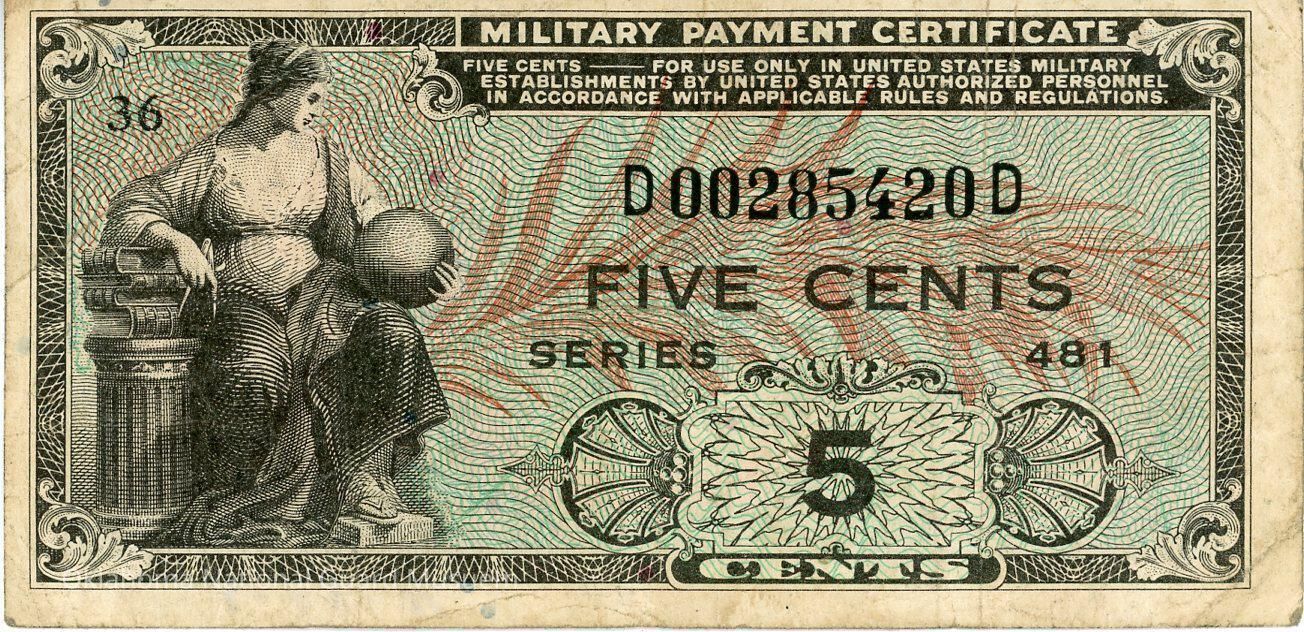United States Military Payment Certificate Five Cents-1951-1954. Accession number written on reverse in bottom right cornerContext