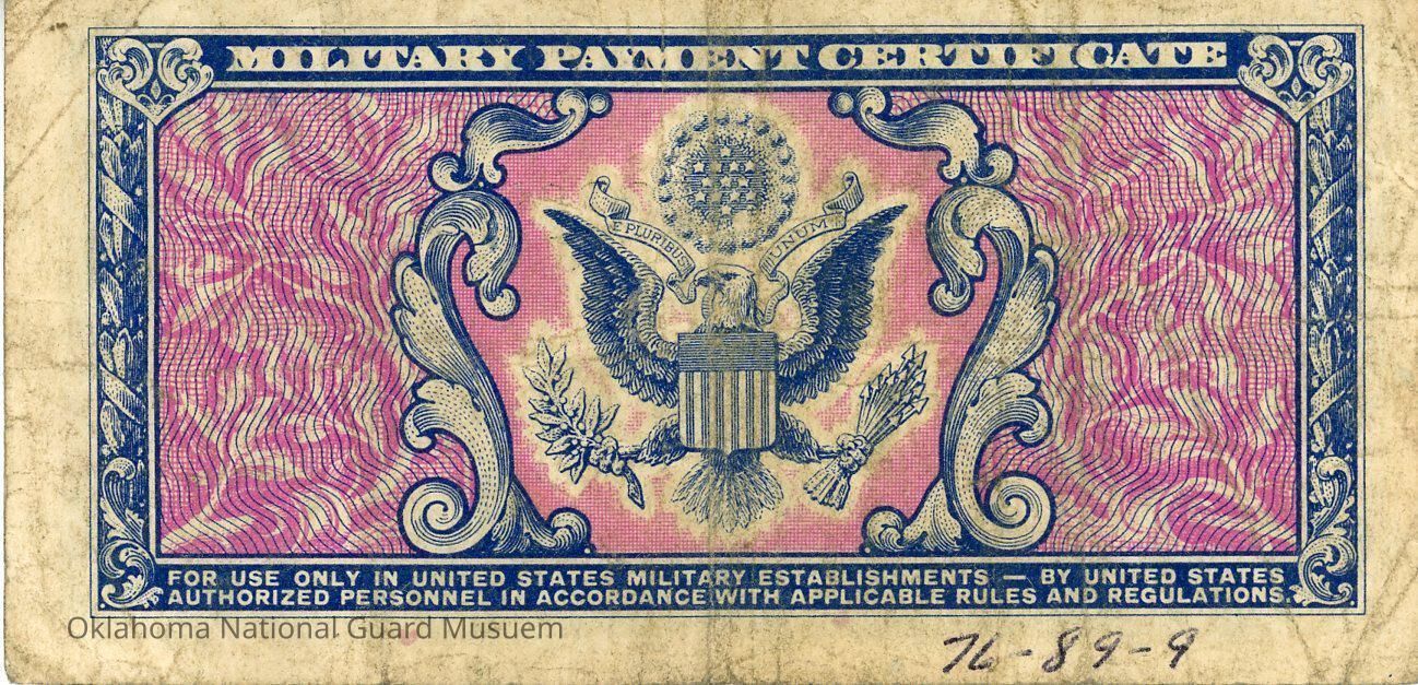 Military payment certificates, or MPC, were a form of currency used to pay U.S. military personnel in certain foreign countries. They were used in one area or another from a few months after the end of World War II until a few months after the end of U.S. participation in the Vietnam War – from 1946 until 1973. MPCs evolved from Allied Military Currency as a response to the large amounts of US Dollars circulated by American servicemen in post-World War II Europe. The local citizens might not trust local currencies, as the future of their governments was unclear. Preferring a stable currency like U.S. dollars, local civilians often accepted payment in dollars for less than the accepted conversion rates. Dollars became more favorable to hold, inflating the local currencies and thwarting plans to stabilize local economies. Contributing to this problem was the fact that troops were being paid in dollars, which they could convert in unlimited amounts to the local currency with merchants at the floating (black market) conversion rate, which was much more favorable to the GIs than the government fixed conversion rate. To reduce profiteering from currency arbitrage, the U.S. military devised the MPC program. MPC were paper money initially denominated in amounts of 5¢, 10¢, 25¢, 50¢, $1, $5, and $10; a $20 note was added in 1968. Unlike US currency, these certificates were issued under the authority of the Department of War (later Department of Defense) rather than the Department of the Treasury. Consequently, they do not bear the US Treasury seal found on virtually every example of US civilian currency. MPCs were fully convertible to U.S. dollars upon leaving a designated MPC zone, and convertible to local currencies when going on leave (but not vice versa). It was illegal for unauthorized personnel to possess MPC, and that policy, in theory, eliminated U.S. dollars from local economiesCollection