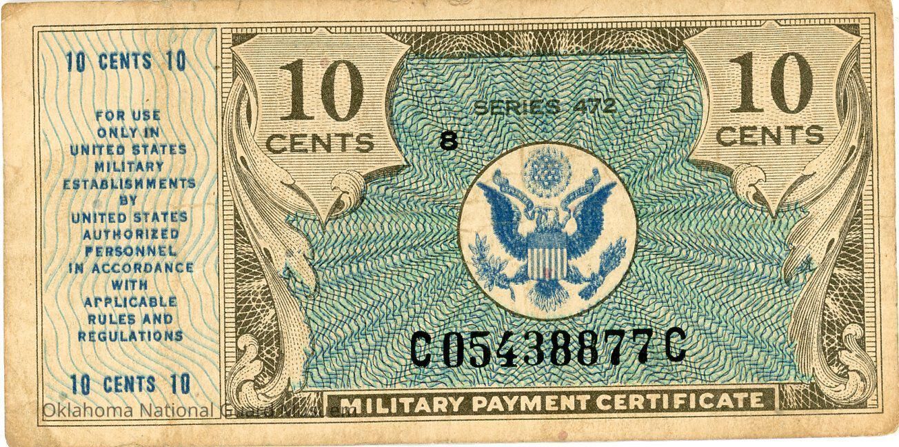 United States Military Payment Certificate Ten Cents-1948-1951. Accession number written on reverse in lower right corner.Context