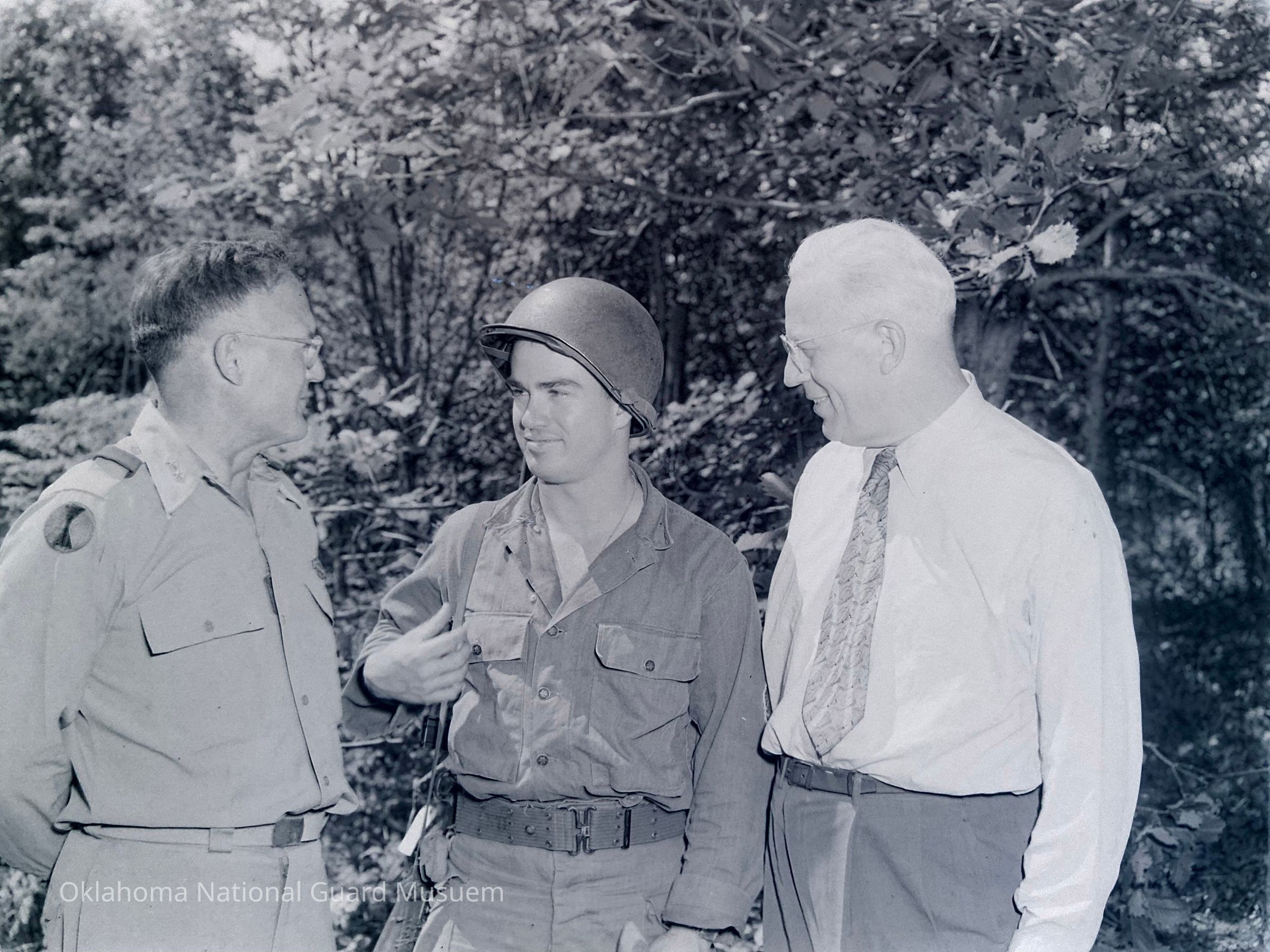 Unknown General and Govenor Earl Warren visiting with a soldier