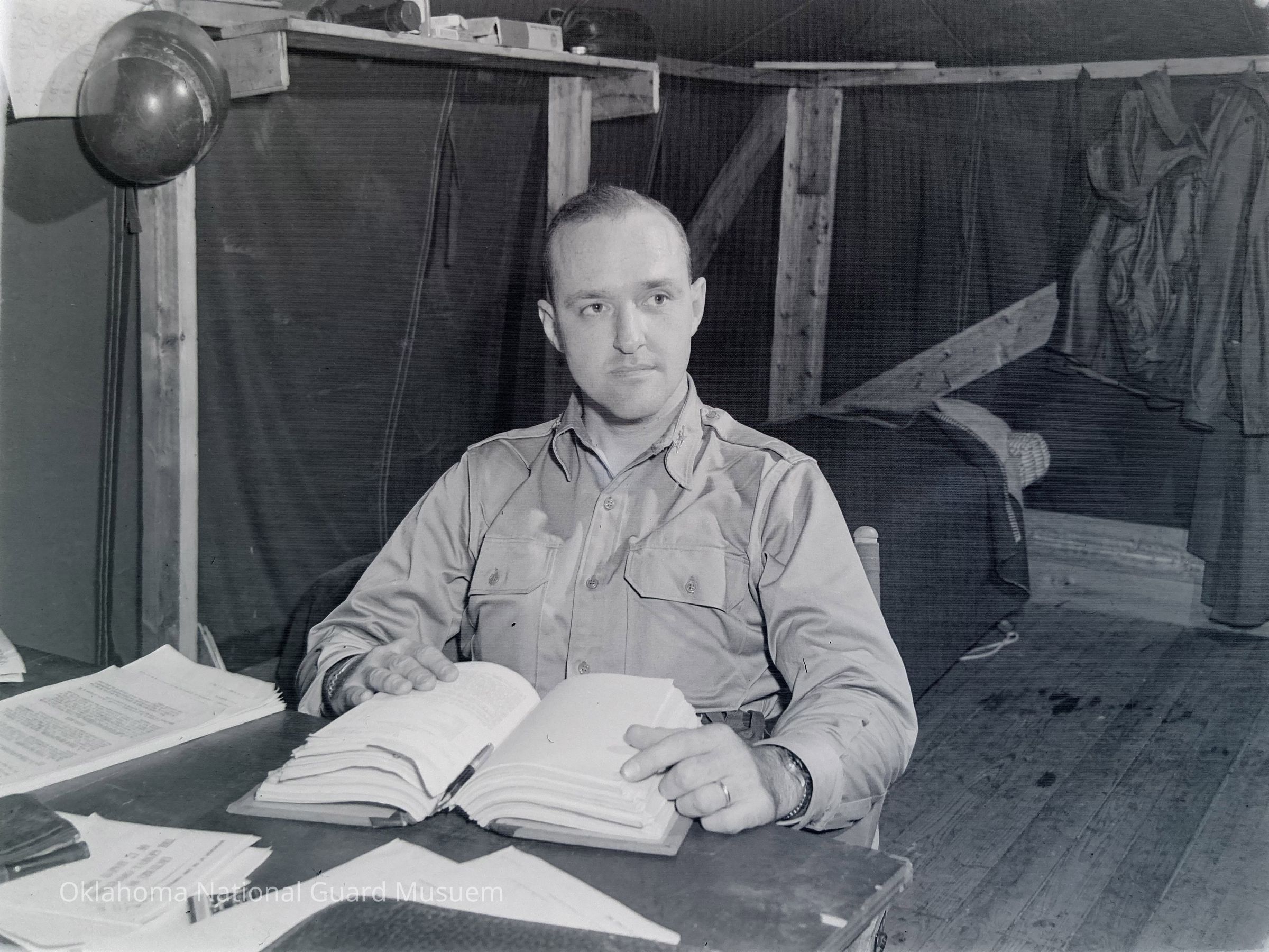 Negative of an unknown officer at his desk on Hokkaido, Japan