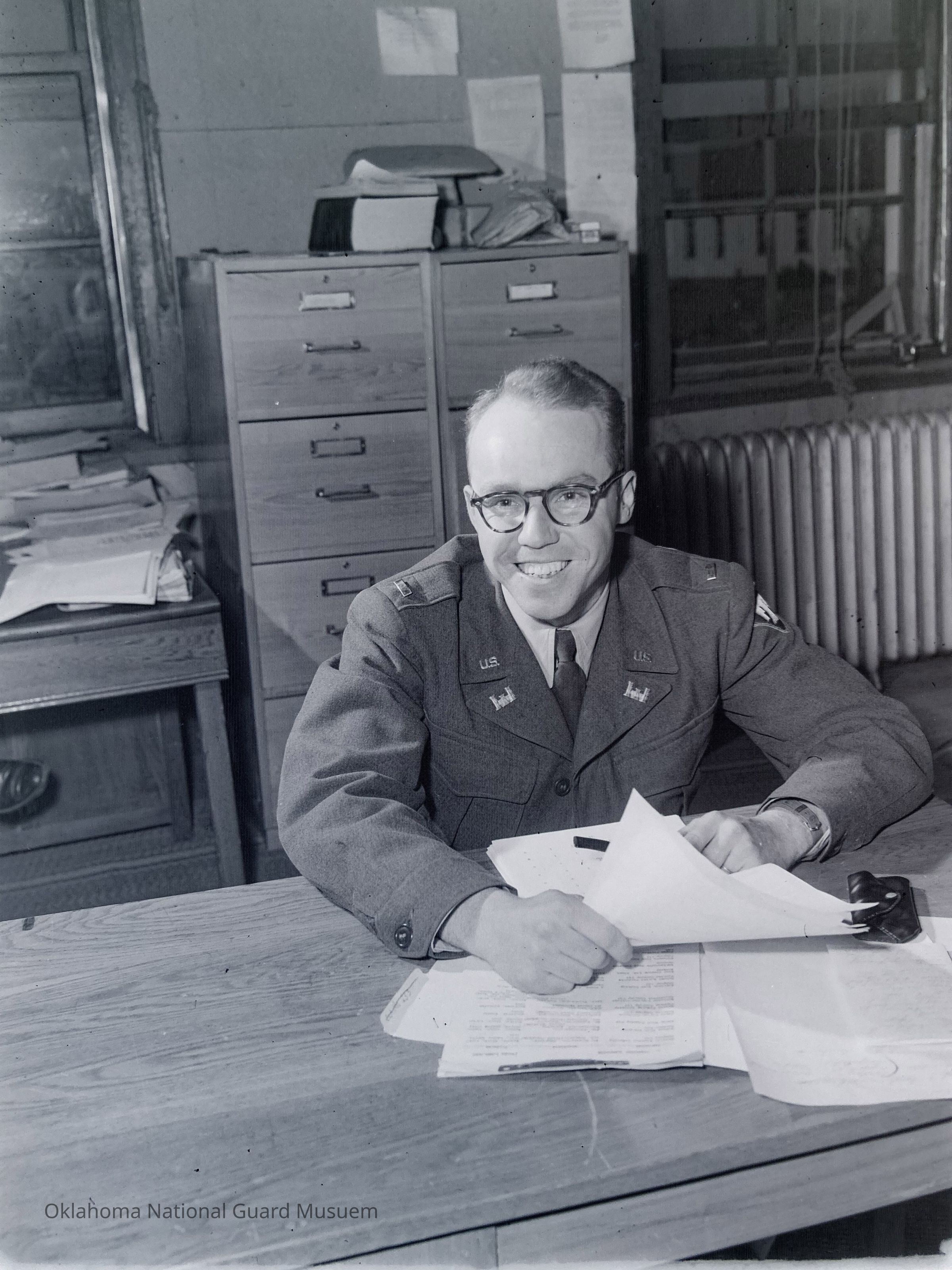 Negative of unknown officer at his desk on Hokkaido, Japan