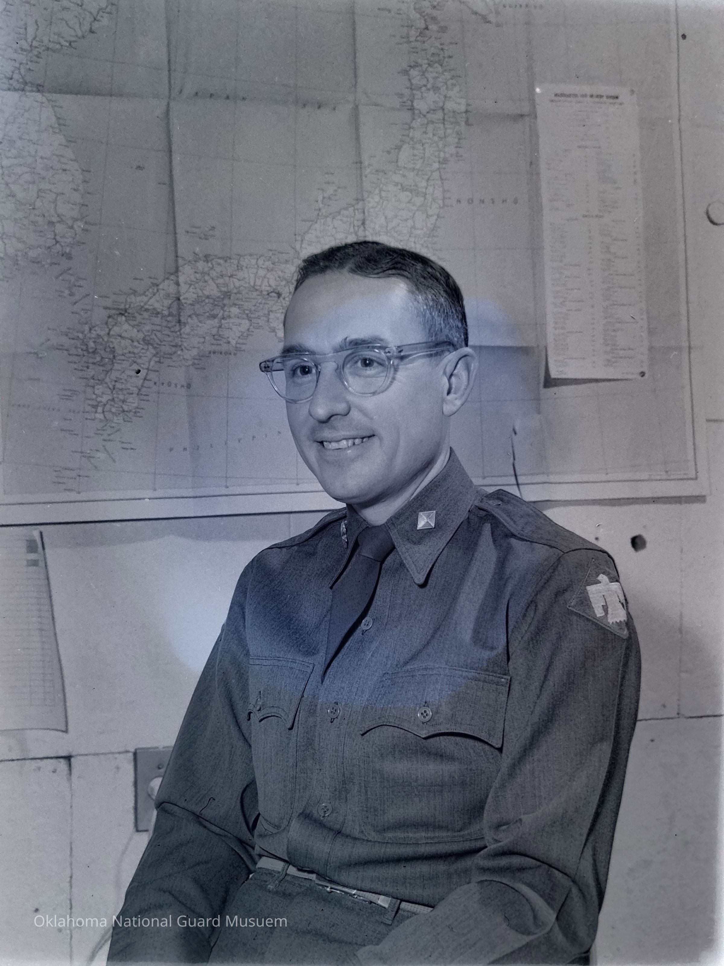 Negative of unknown officer at his desk on Hokkaido, Japan