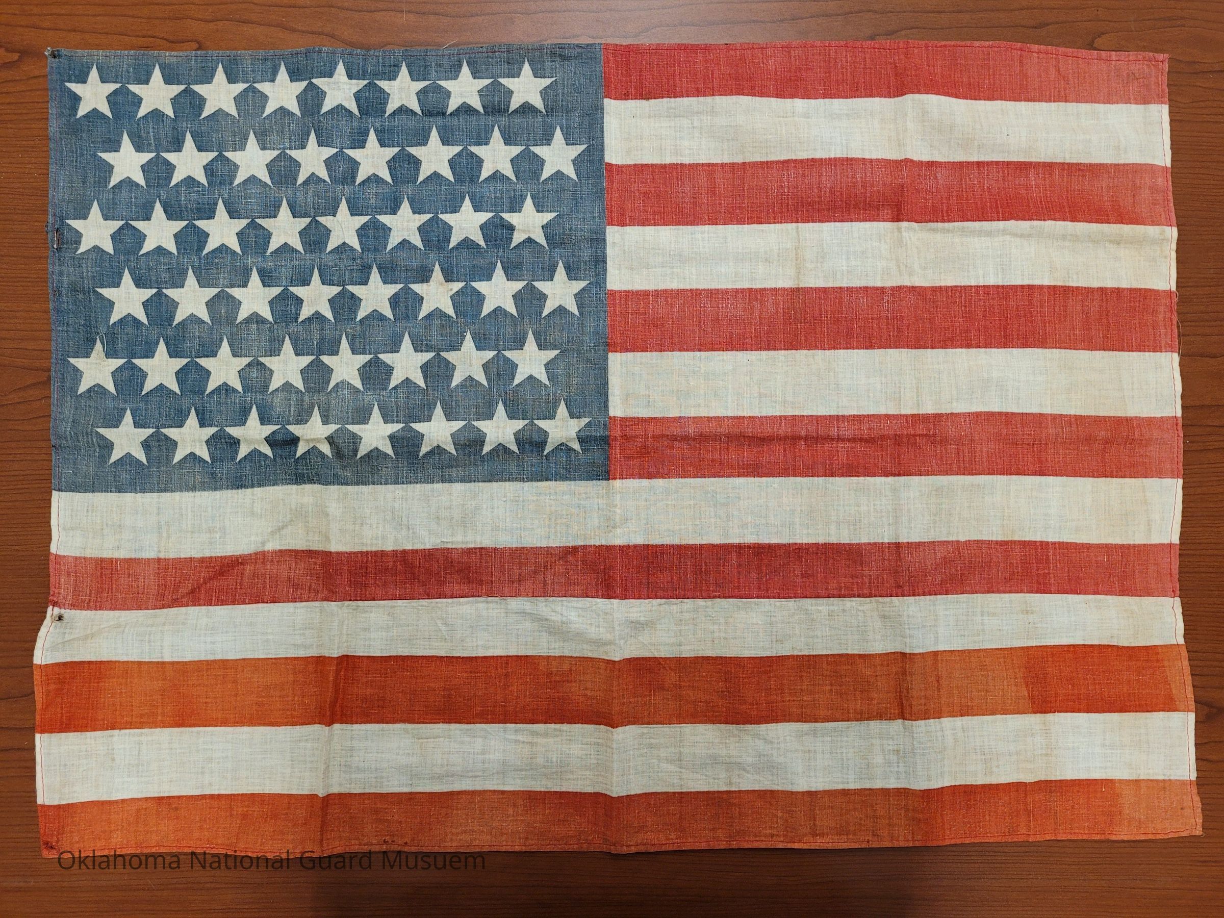 Presented to General Carter during National Guard staff ride in France in 2024. The flag was given to the town by 45th soldier in 1944 after the liberation. It flew in the center of town until it was retired and replaced with a larger US flag. Given to Carter by the town of Clerval to donate to the museum in November 2024