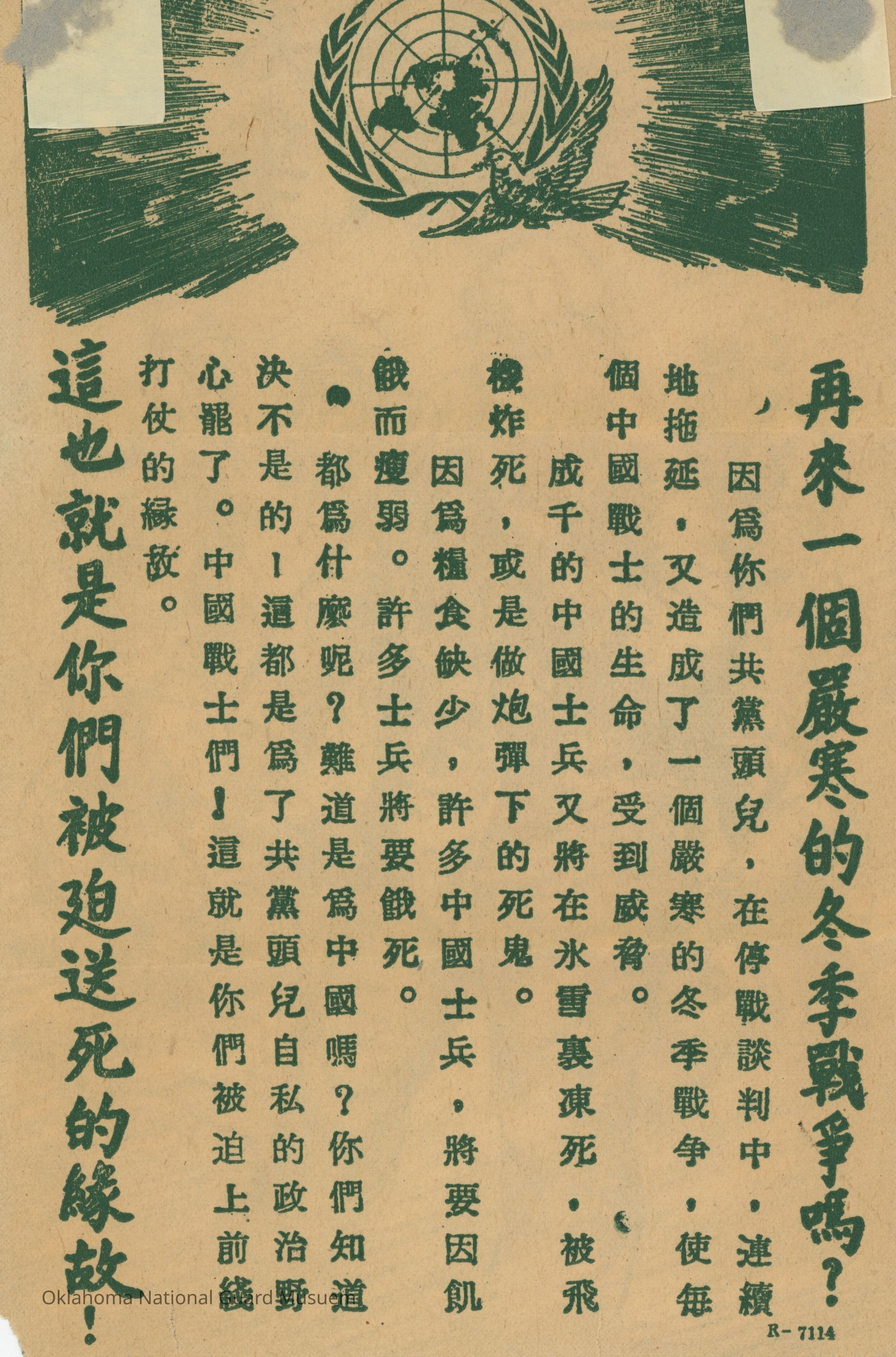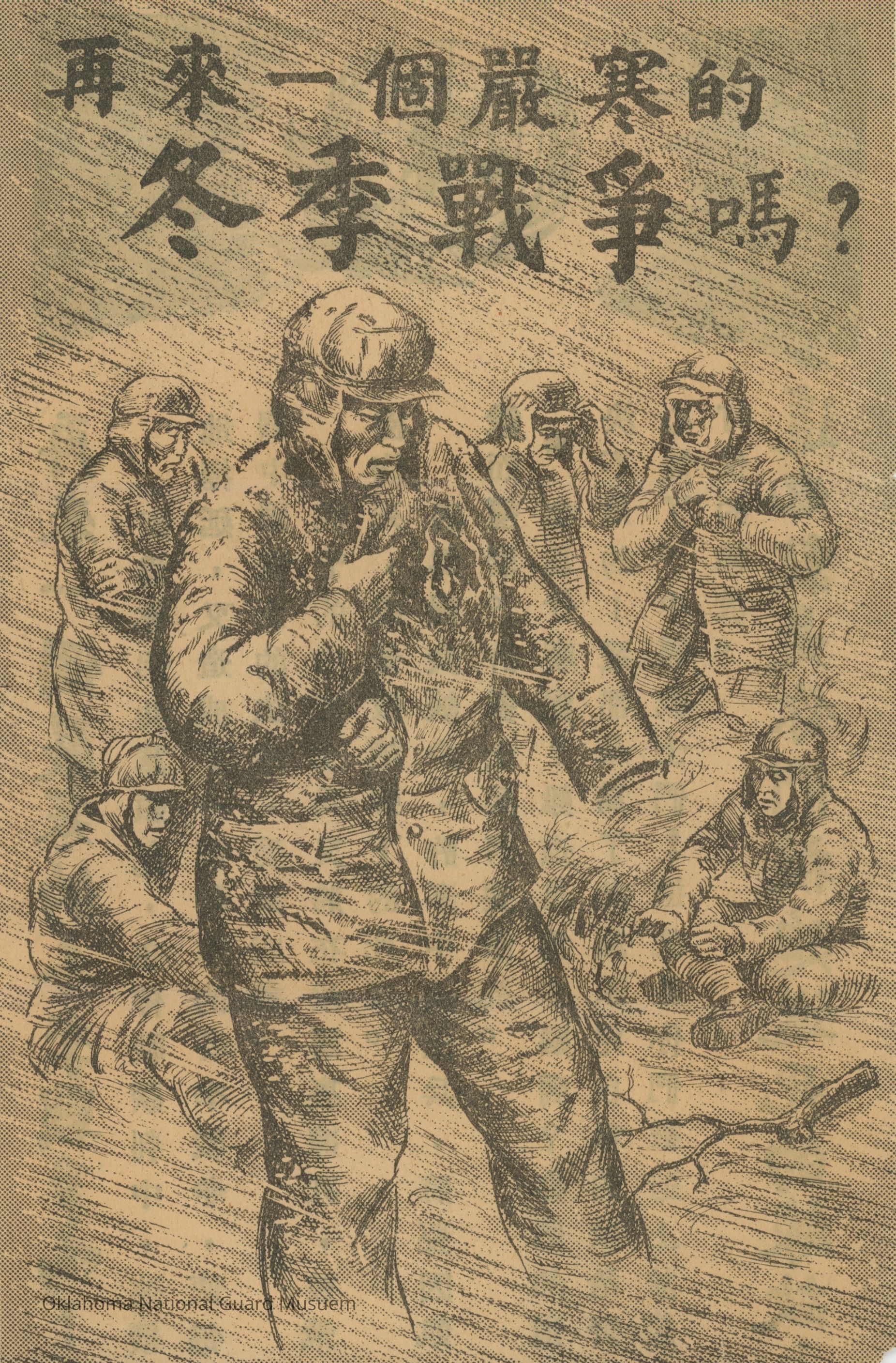 US propaganda leaflet dropped on Communist soldiers during the Korean War. The front shows cold Communist Chinese soldiers struggling in the winter with the title: "Another Harsh Winter War?"