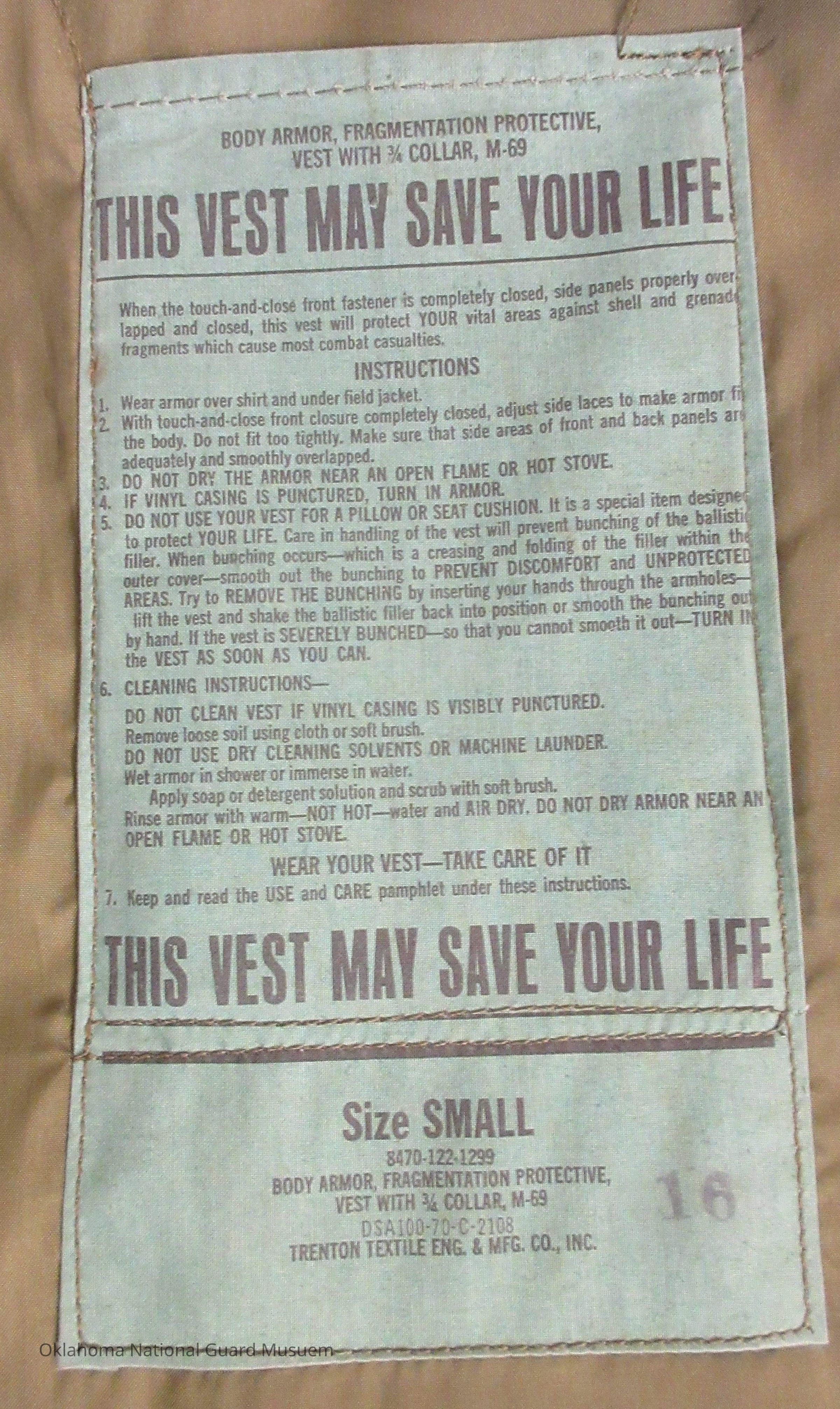 Body Armor, Fragmentation Protective, Vest with Collar M-69 with Velcro Closure.