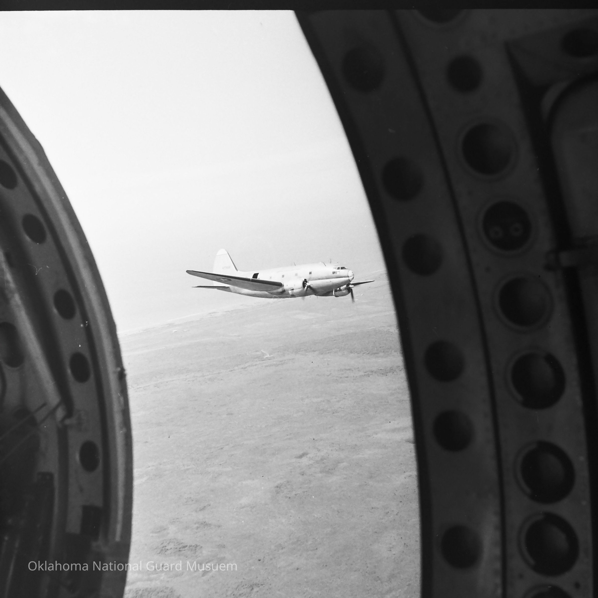 Negative of a view of a C-46 aircraft in flight from another aircraft