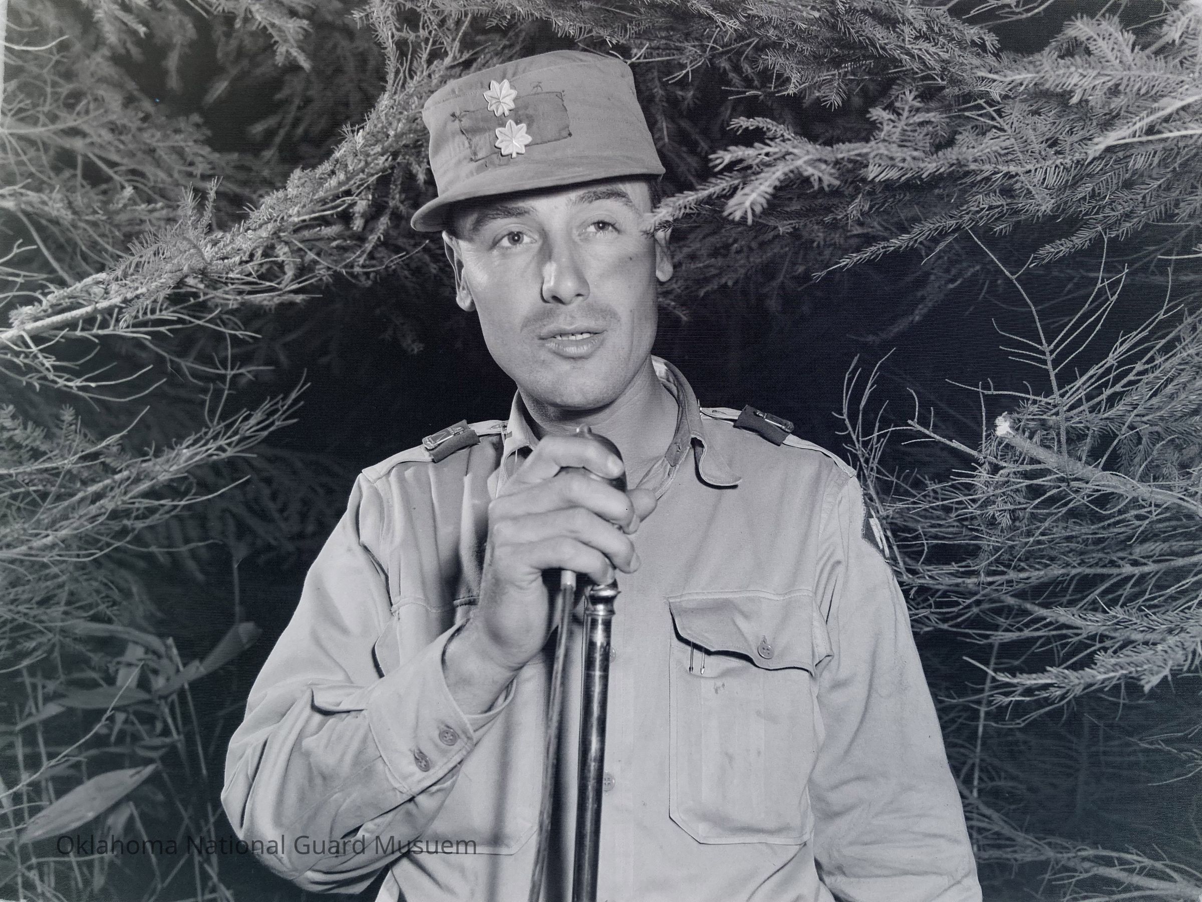 Negative of war game enemy officer, George Parish, at microphone