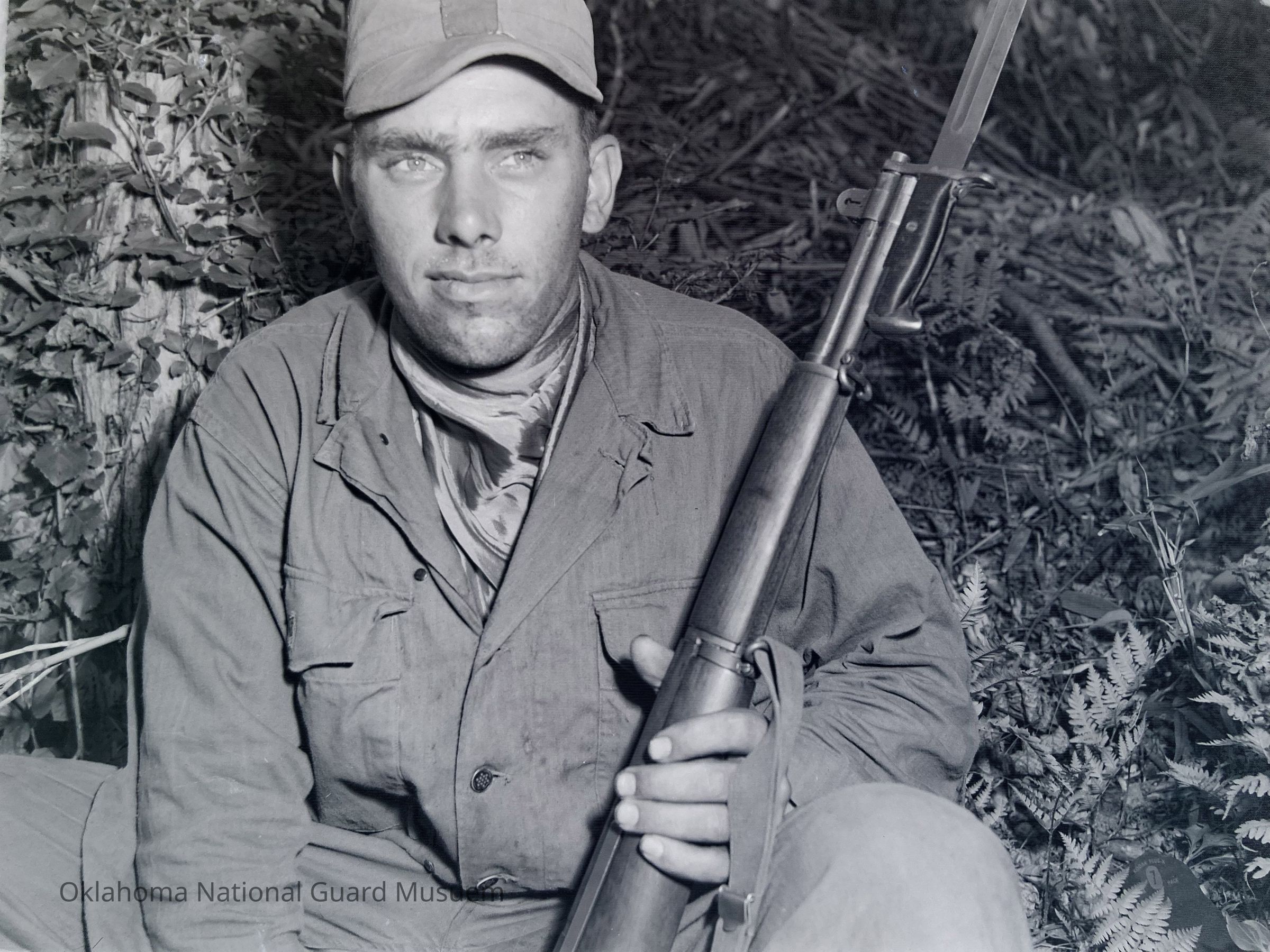 Negative of a war game "enemy soldier" holding an M-1 with bayonet on Hokkaido, Japan.