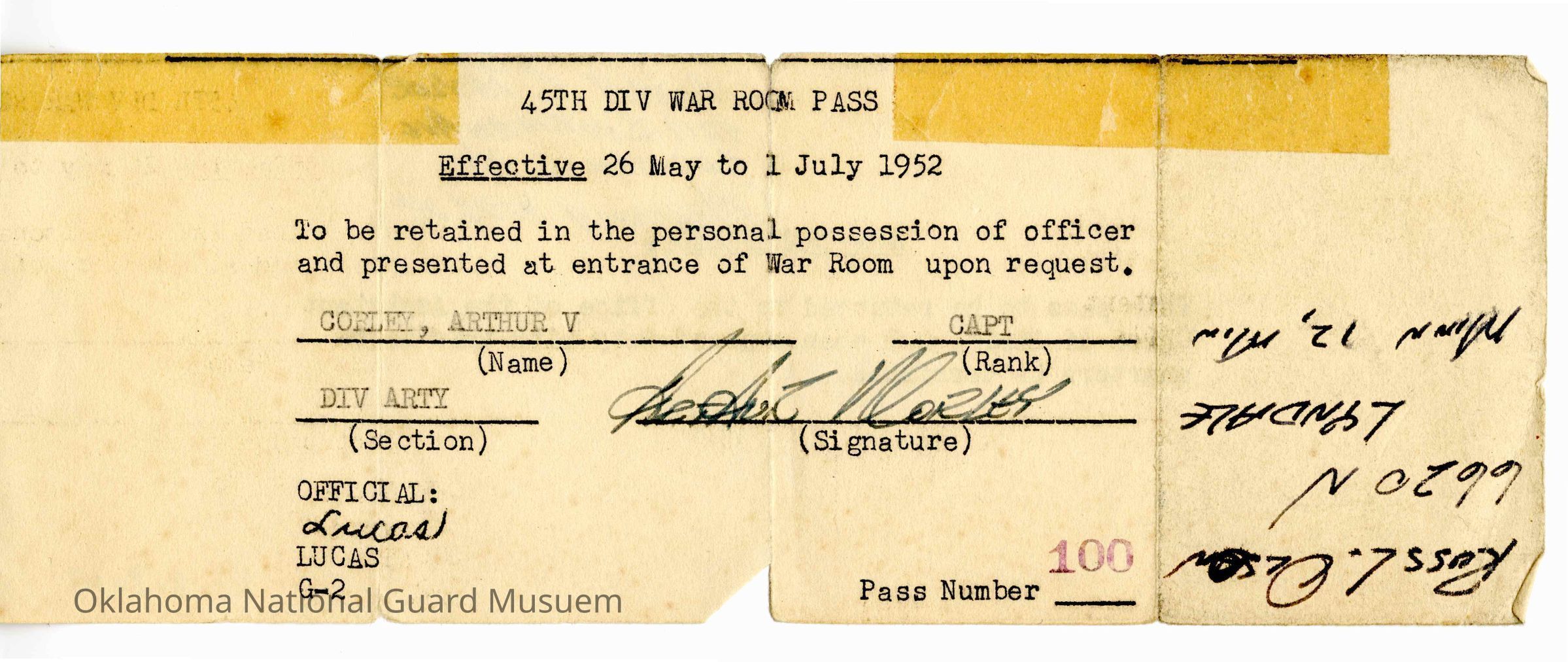 War Room Pass for Arthur V. Corley, 45th Division Artillery