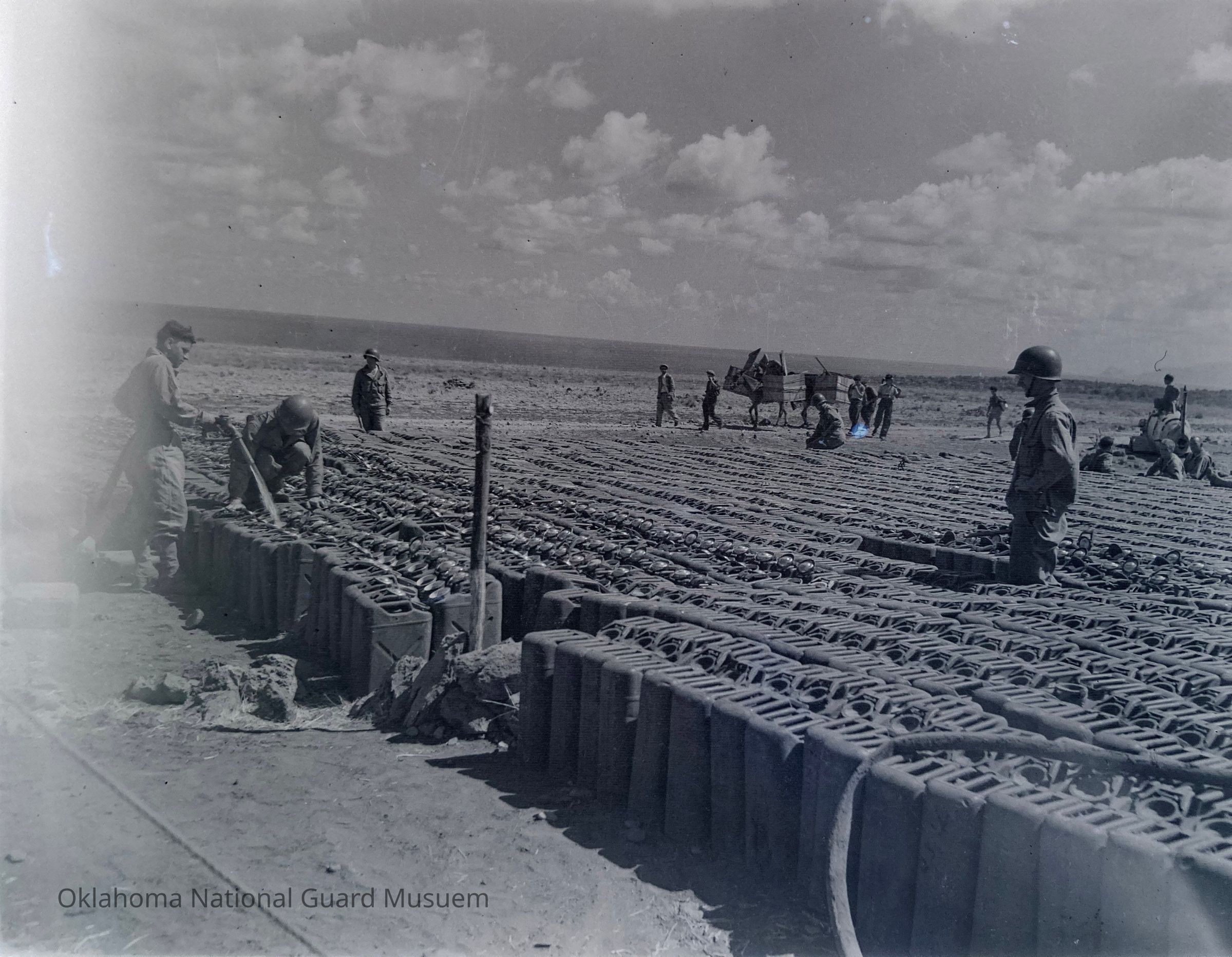 Negative of water cans being filled in preparation of the invasion of Italy. 120th Engineers