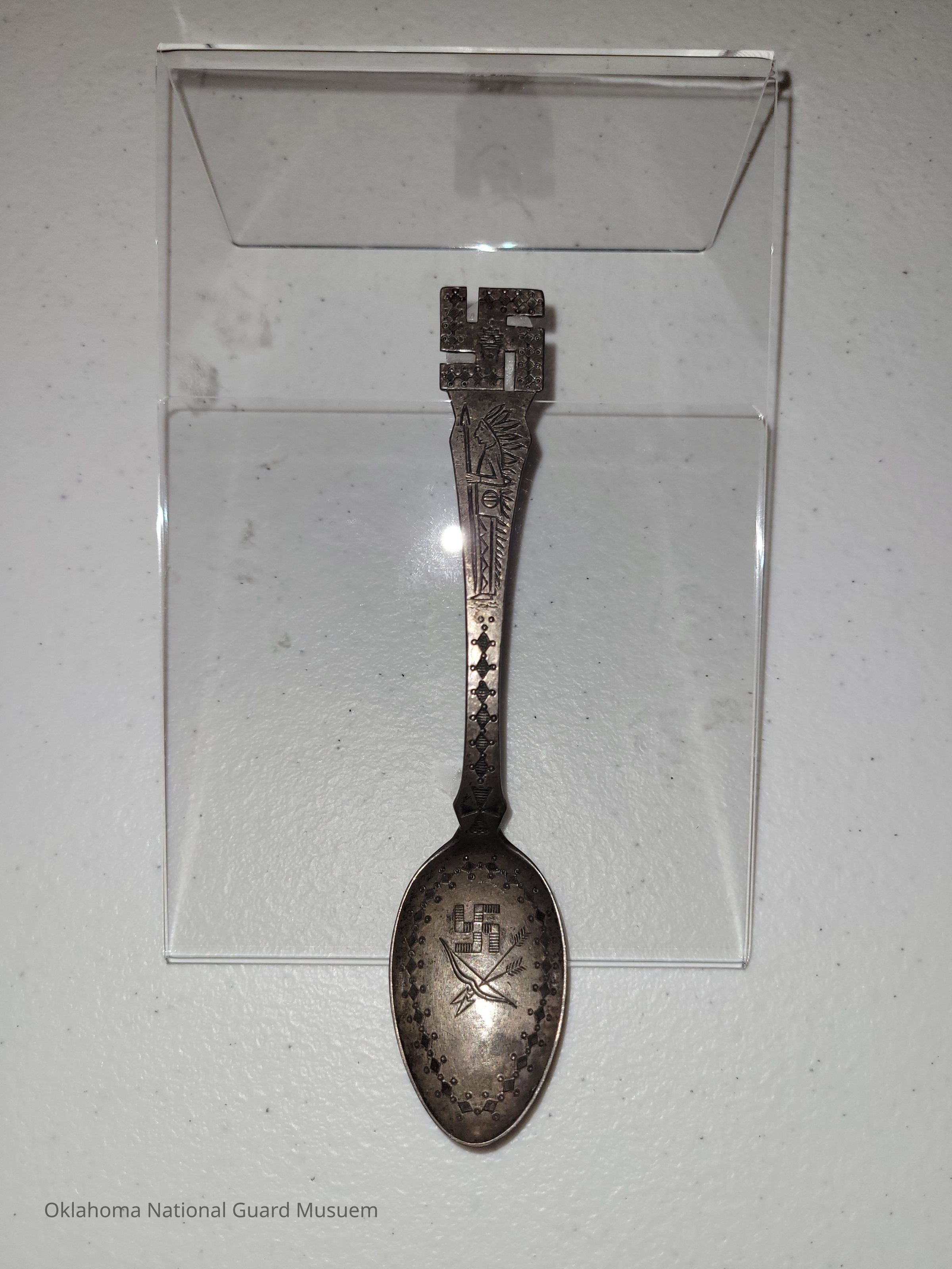 Whirling Logs Spoon. Indian and bow and arrow carved in the handle and bowl of the spoon