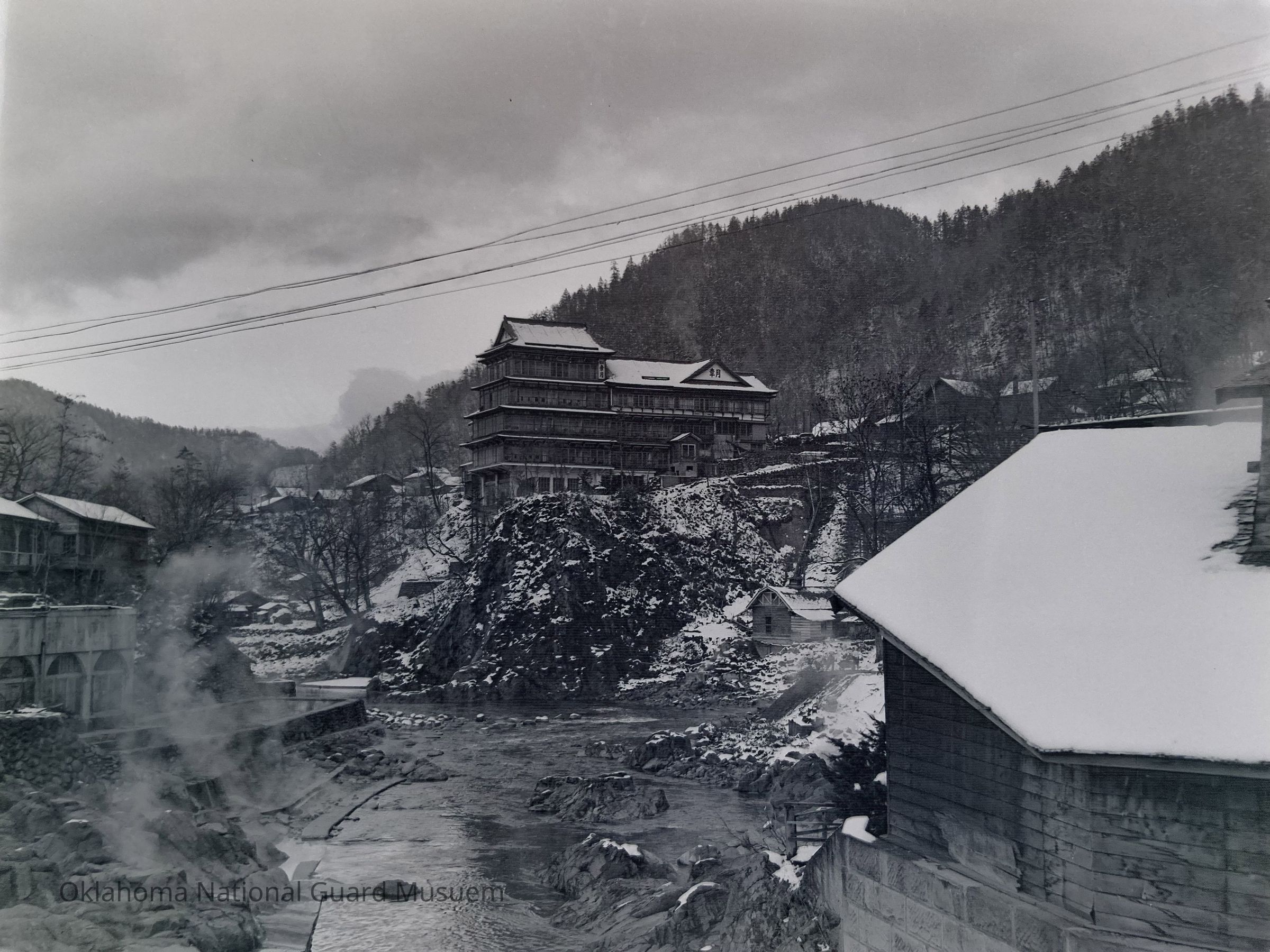 Negative of a winter view of a town and river on Hokkaido, Japan