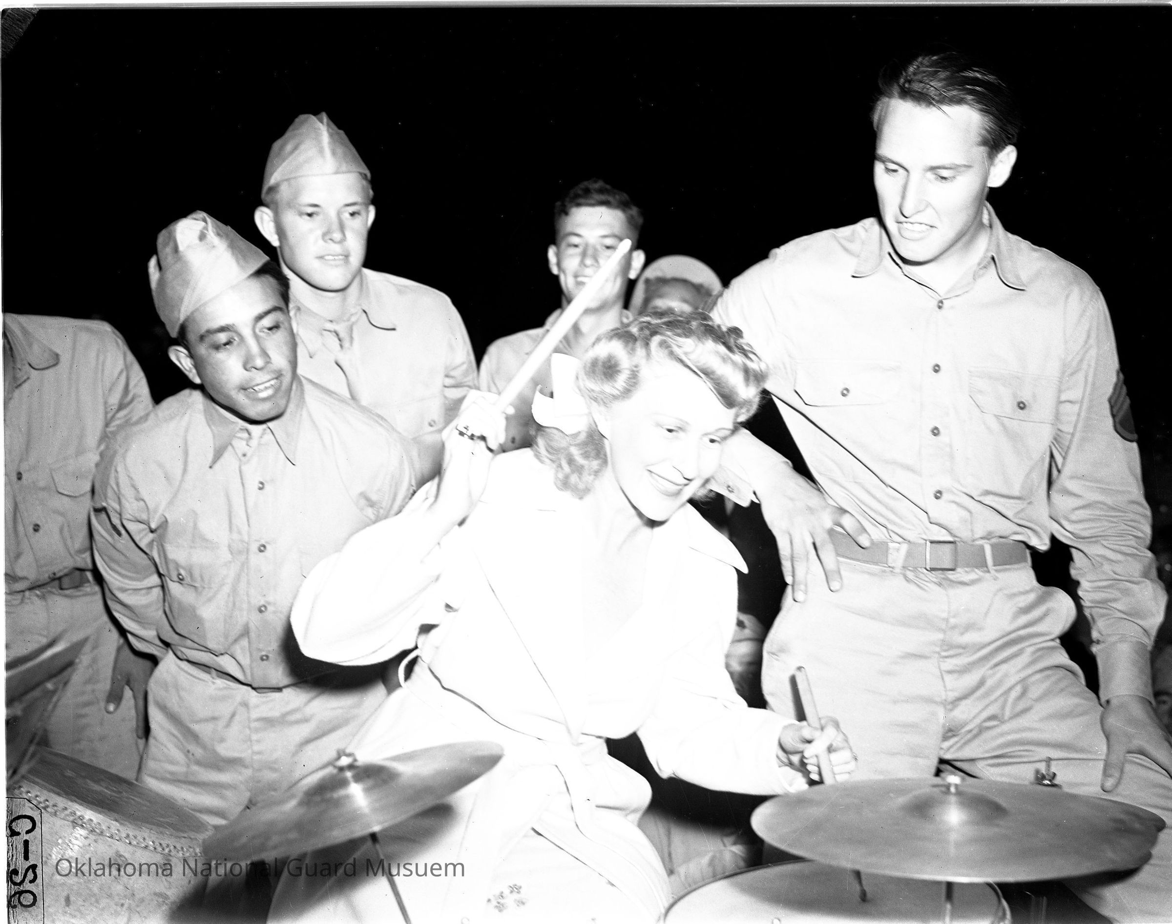 Negative of a woman playing drums with soldiers looking over her shoulder