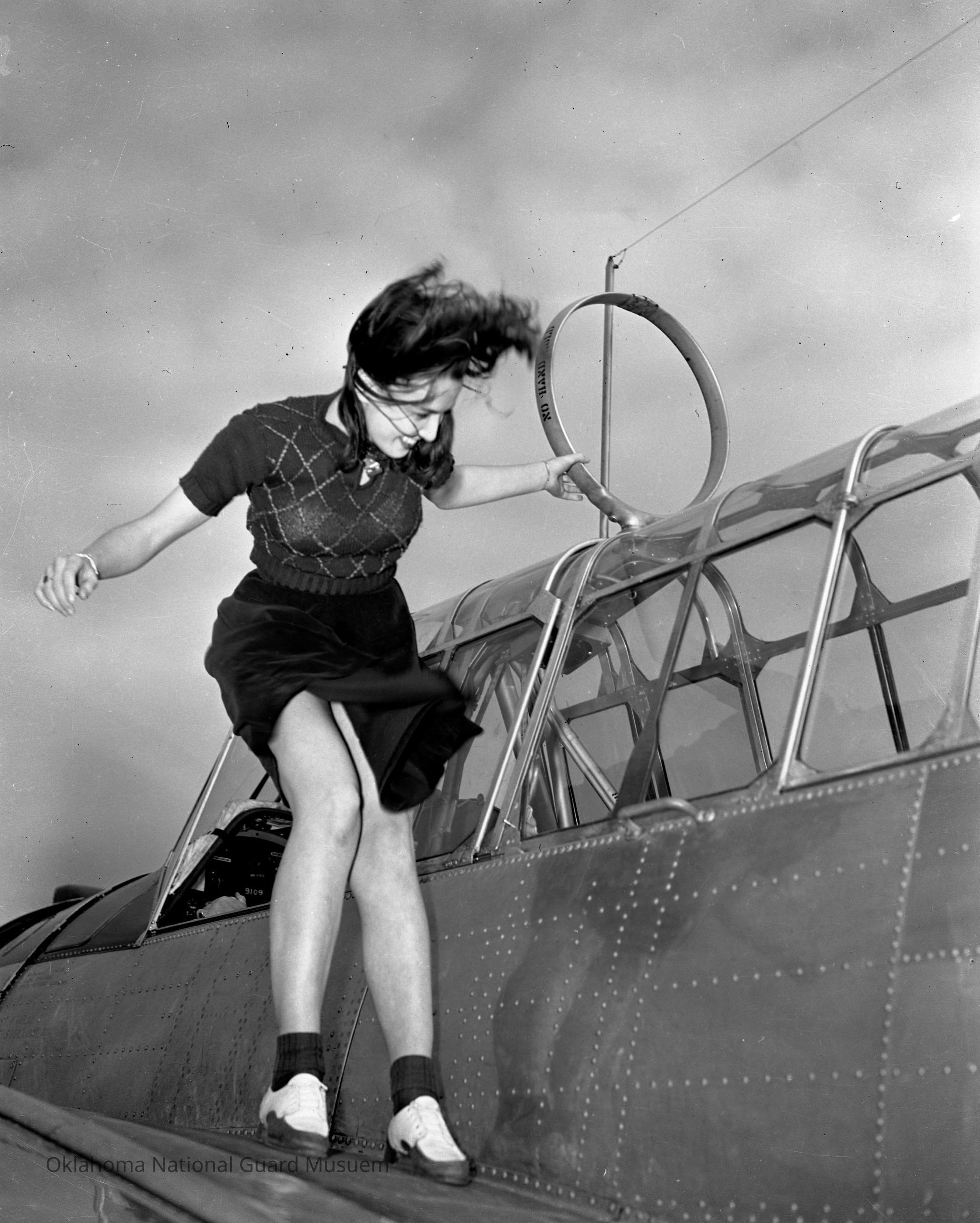 Woman posing on O-47 aircraft wing