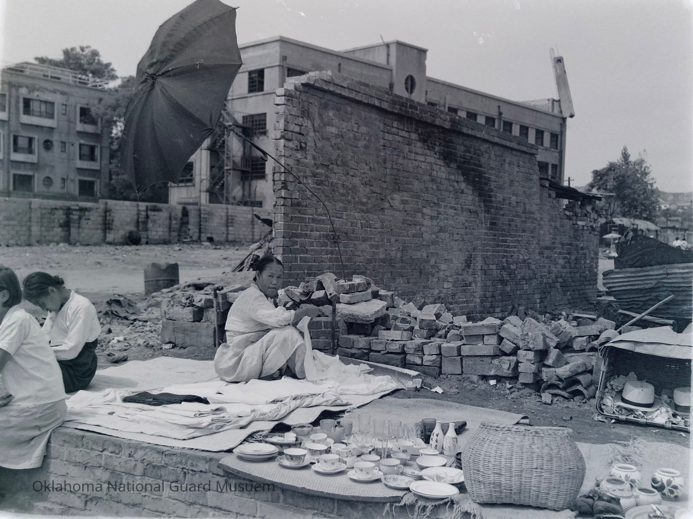 Bomb damage, War damage, Women, Selling, Markets, Cups, Dishes