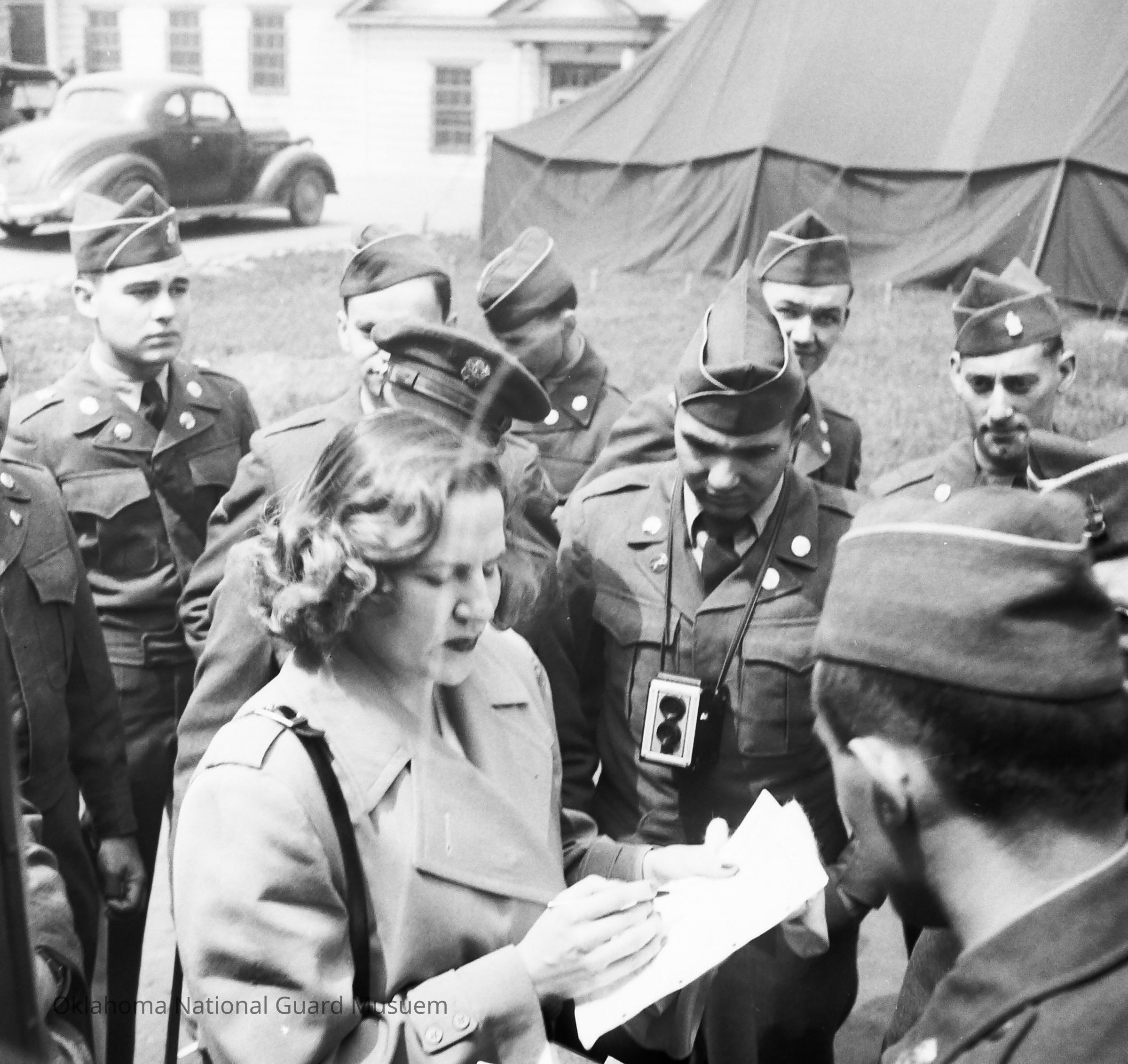 Negative of a woman signing autographs for soldiers