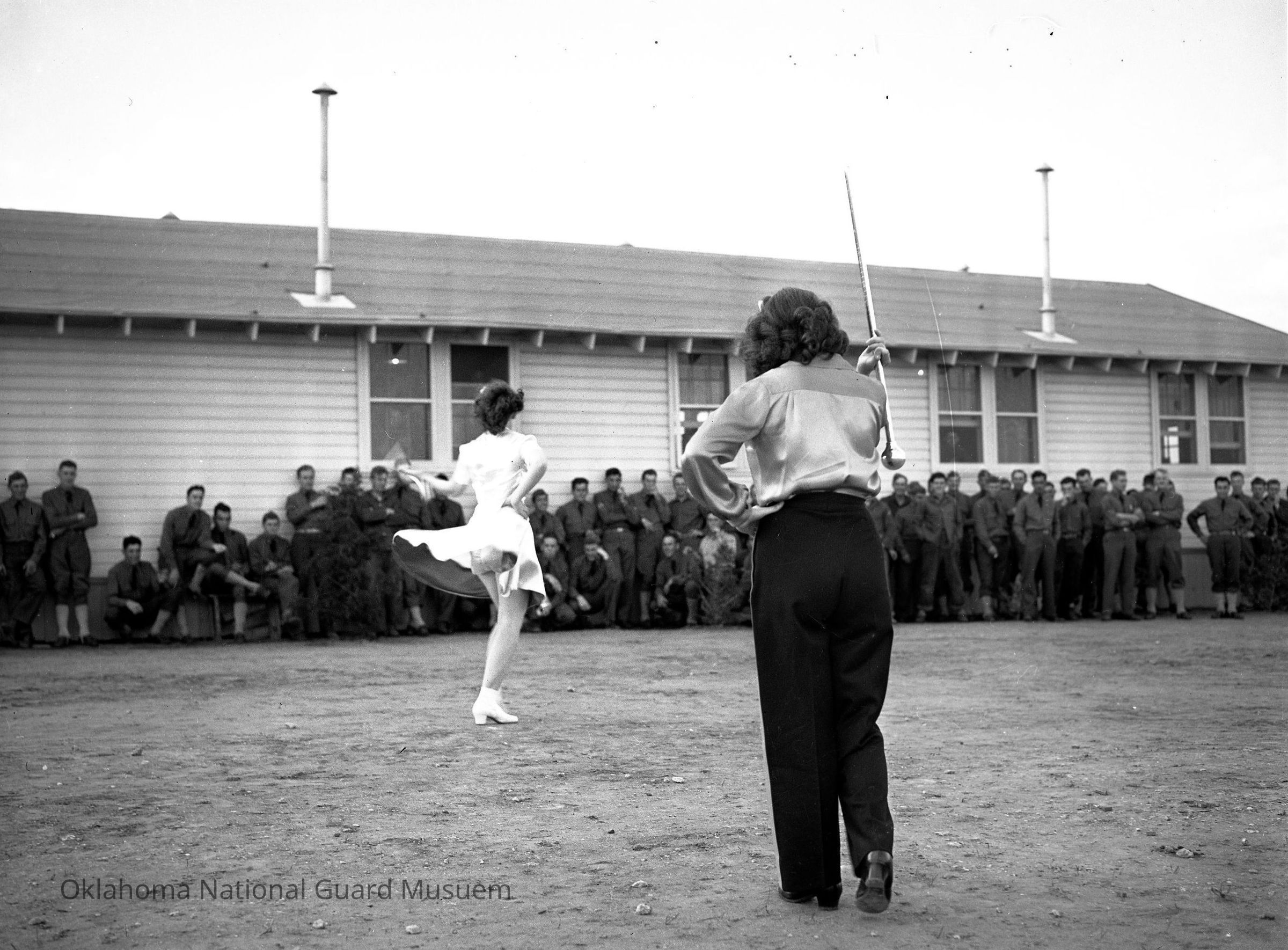 Negative of women dancing for a crowd of soldiers