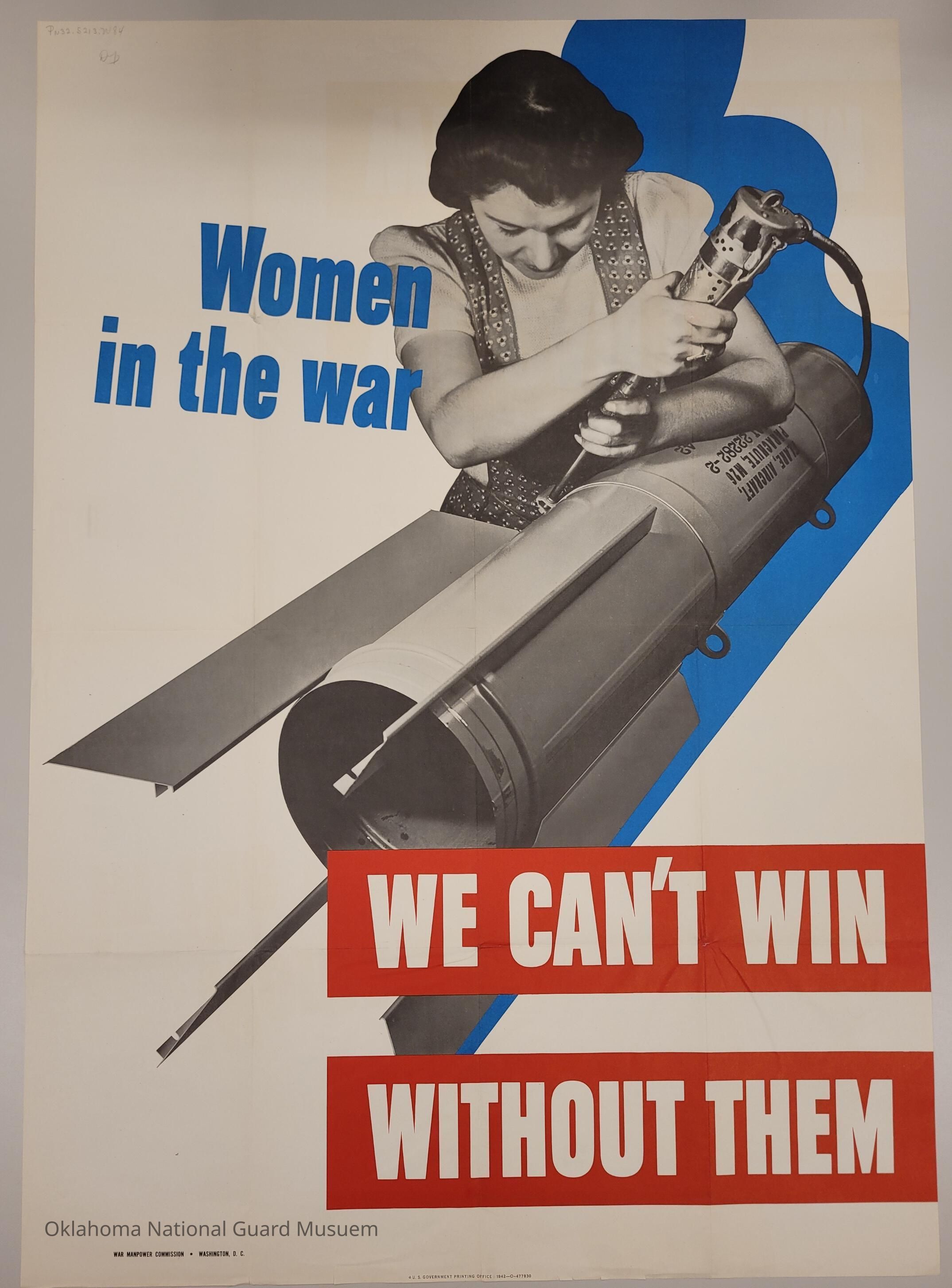 Photograph of a woman factory worker wearing overalls or apron of printed fabric, riveting a weaponCollection