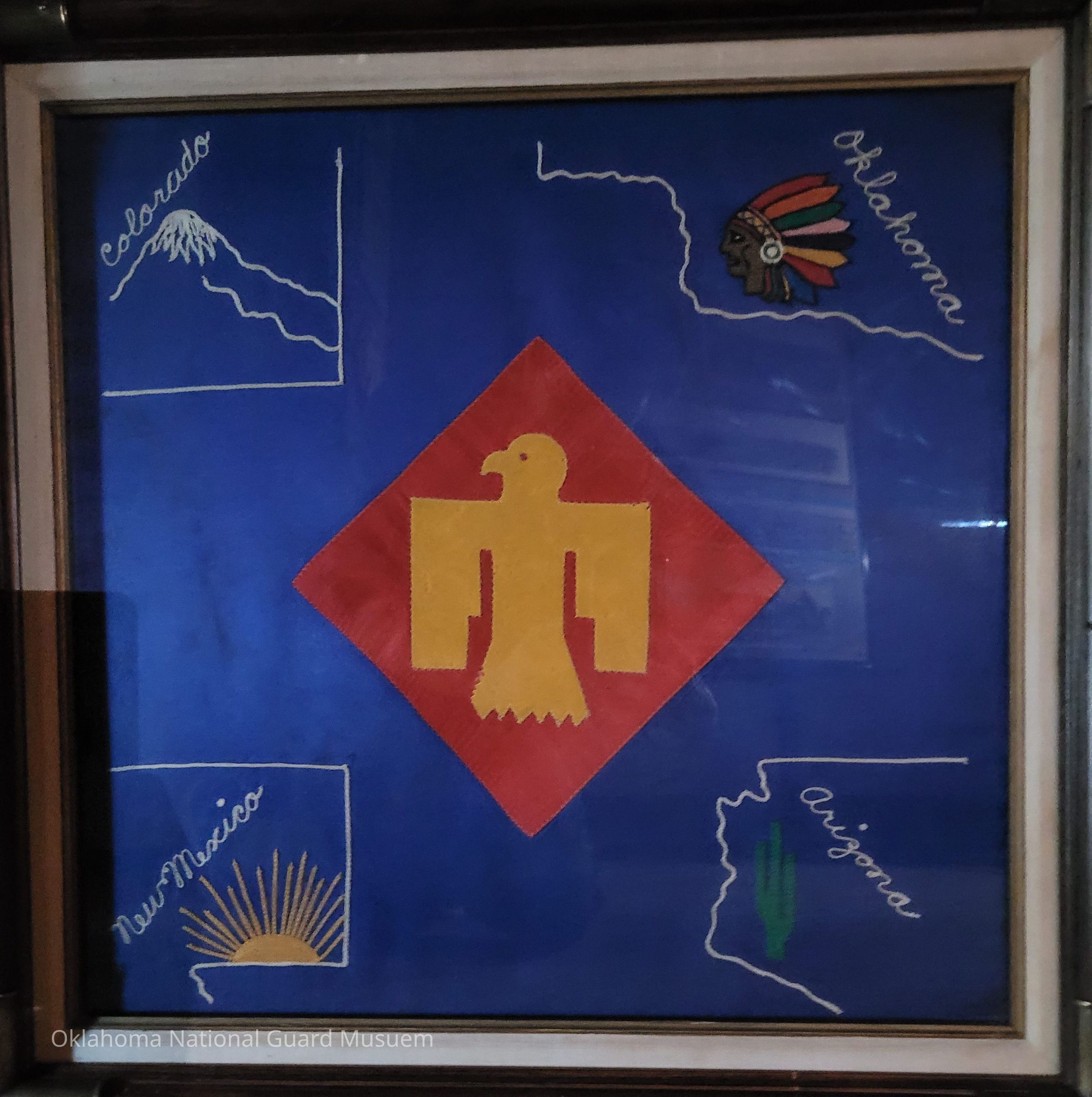 Embroidered Fabric Thunderbird depicting the four states that make up the 45th Division at its foundingMade/Created