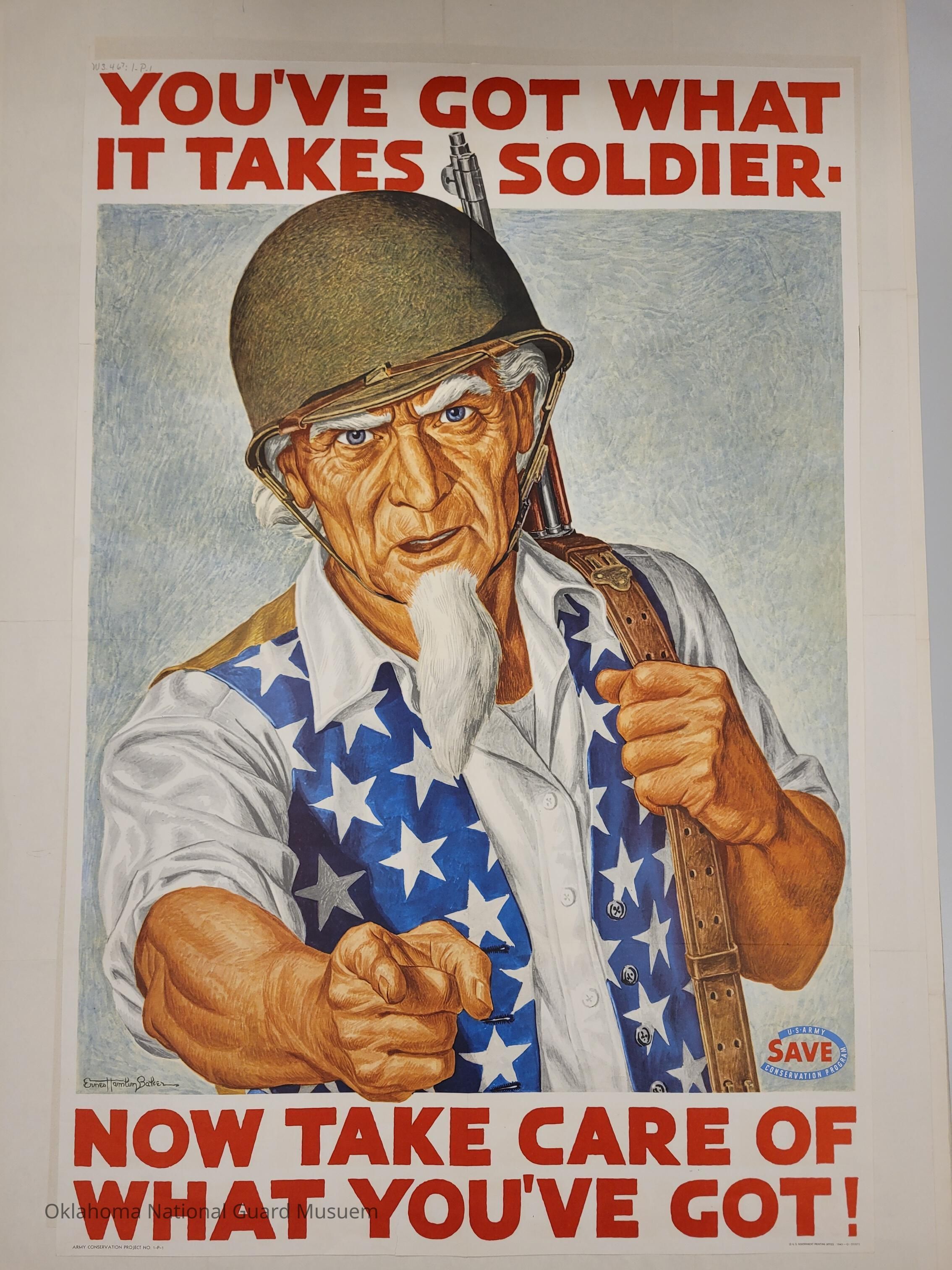 Uncle Sam wearing an army helmet and holding a gun, pointing at the viewer. Text urges soldiers to take care of themselves and their equipmentCollection