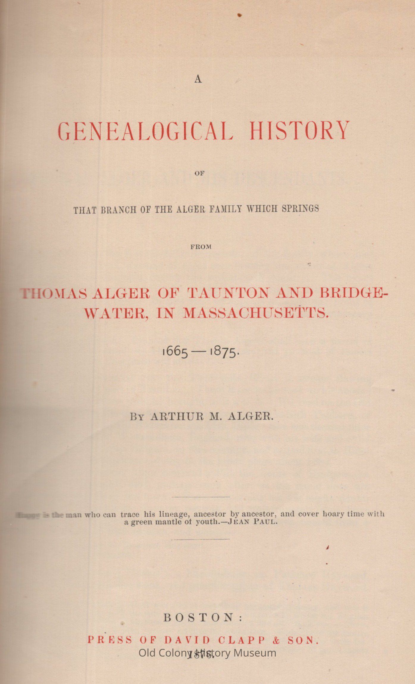 A Genealogical History of That Branch of the Alger Family Which Springs From Thomas Alger of Taunton and BridgewaterEntry/Object ID