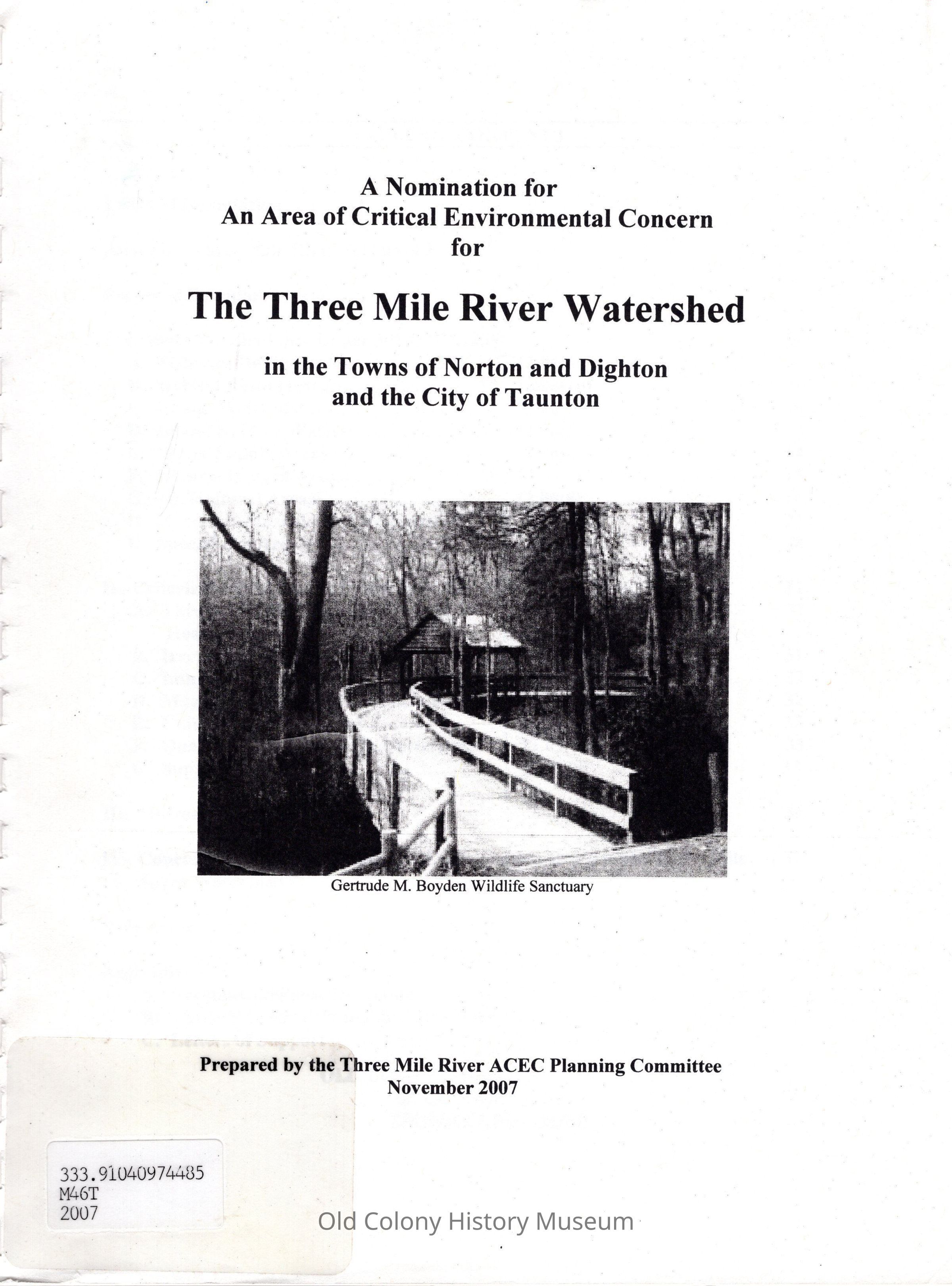 A nomination for an area of critical environmental concern for the Three Mile River Watershed in the Towns of Norton and Dighton and the city of TauntonEntry/Object ID