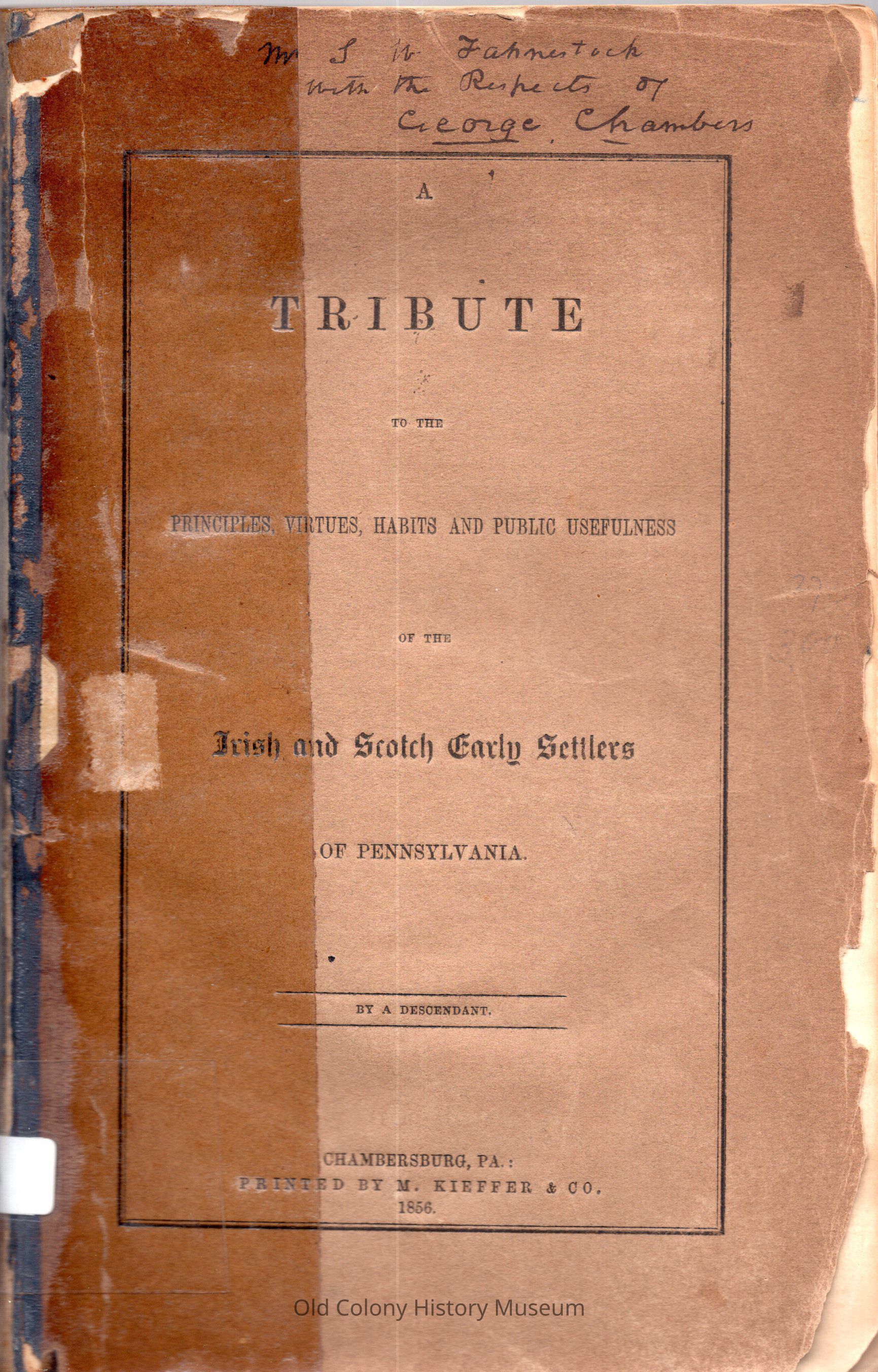 A tribute to the principles, virtues, habits and public usefulness of the Irish and Scotch early settlers of Pennsylvania.; By a descendant.Entry/Object ID
