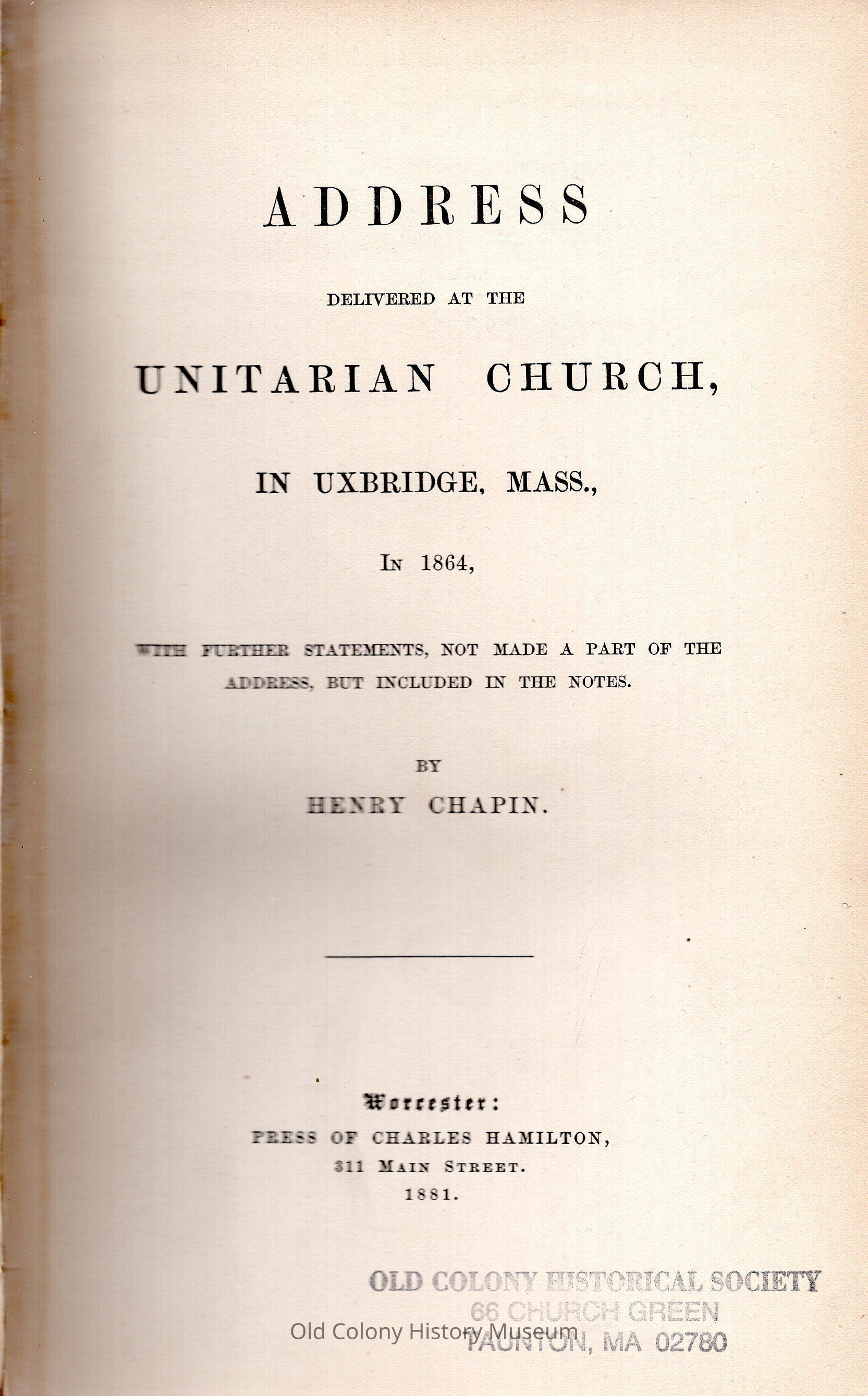 Address Delivered at the Unitarian Church, in Uxbridge, Mass, in 1864: With Further Statements Not Made A Part of the Address But Included in the NotesEntry/Object ID