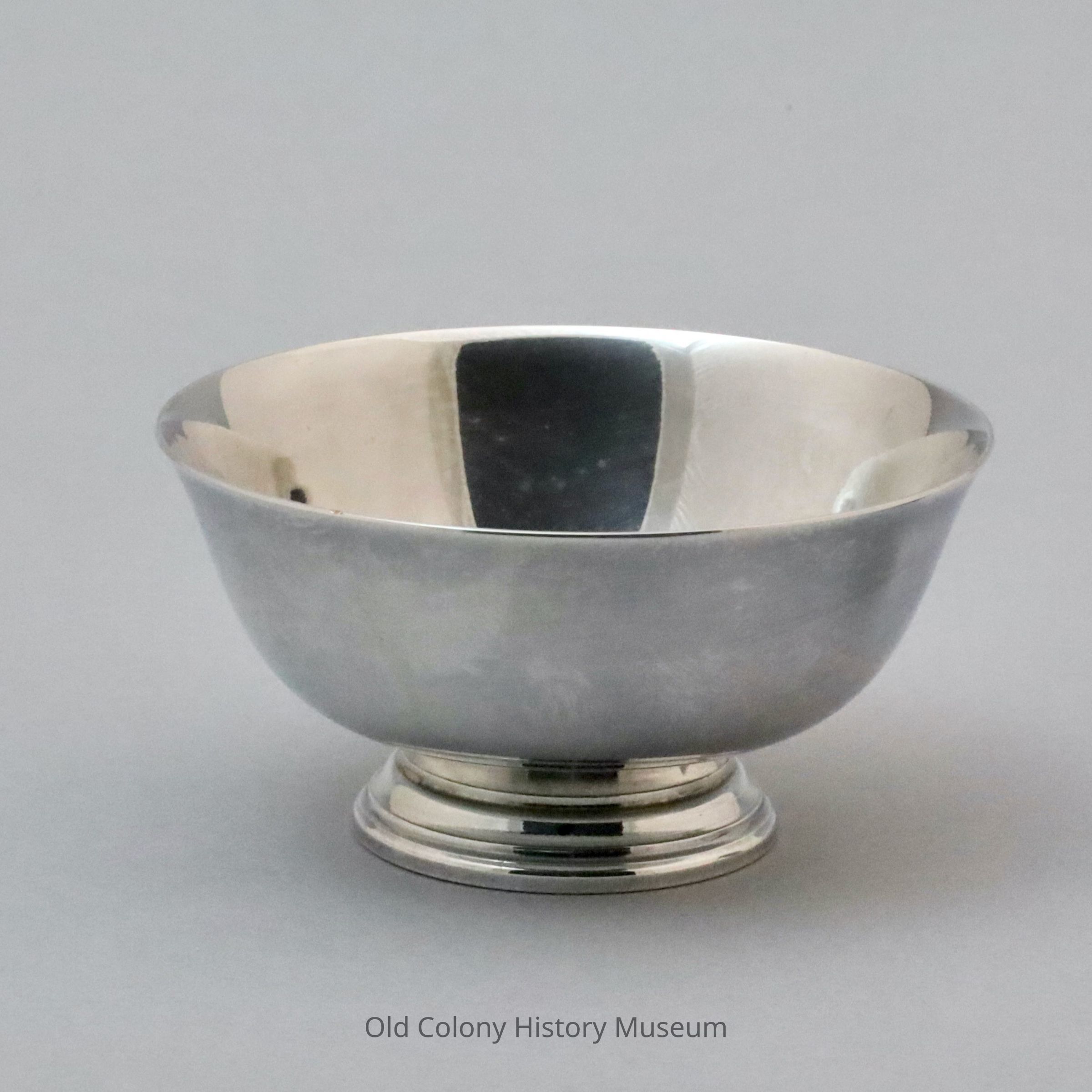 A: Simple sterling miniature Revere bowl with wide, deep bowl. Pedestal tiered base, simple design. Engraved at bottom with maker's mark B: Original square box for bowl; bottom is heave stock light blue and white patterned paper with flowers and geometric shapes. The box bottom looks like a pedestal with two tiers. The top/inside of box is royal blue velous with raised circular stand at center for bowl to rest into. Cover is clear plastic.Made/Created