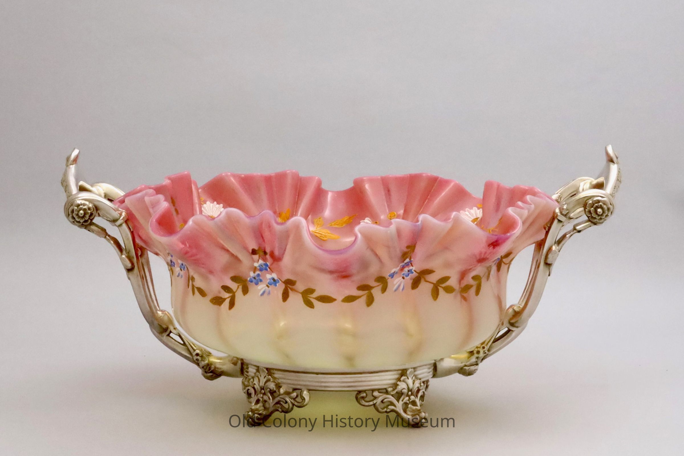 a) Silver plate stand with round base and two handles each with rosette supports. Floral design at top of each splayed foot b) Mold blown bowl is of opaque pink and yellow overlay glass with a fluted edge and enameled pink flowers with gold applied leaves.