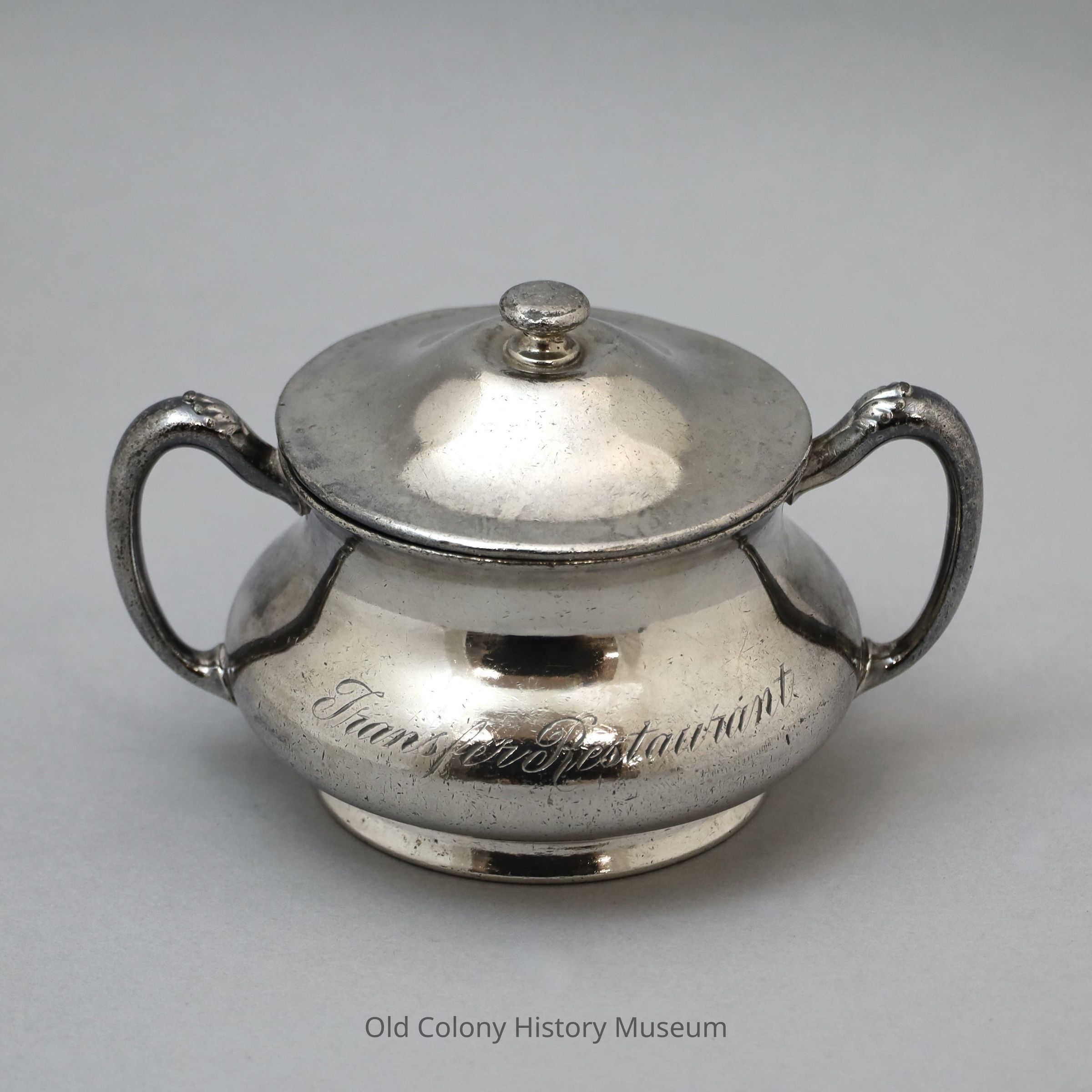 Reed& Barton sugar bowl, Transfer Restaurant. Marked: "Reed & Barton 1575 20 Oz. Pat. Feb. 16, 1898." (a) Squat bulbous shaped bowl with plain rim and engraved "Transfer Restaurant" in script. Two C-shaped handles. (b) Removable domed lid with knob finial.Lexicon
