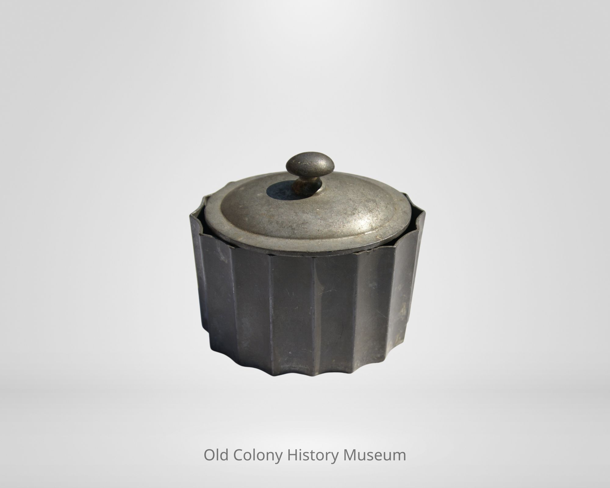 (a) 16 scalloped sides make up this base. Flat bottom. (b) Top has oval finial. Slightly domed oval top. While these two pieces came in together, they were most likely married together at one point. Oval top does not fit into unusually shaped base very well. They were numbered together since they were in use together before coming to the museum.Lexicon